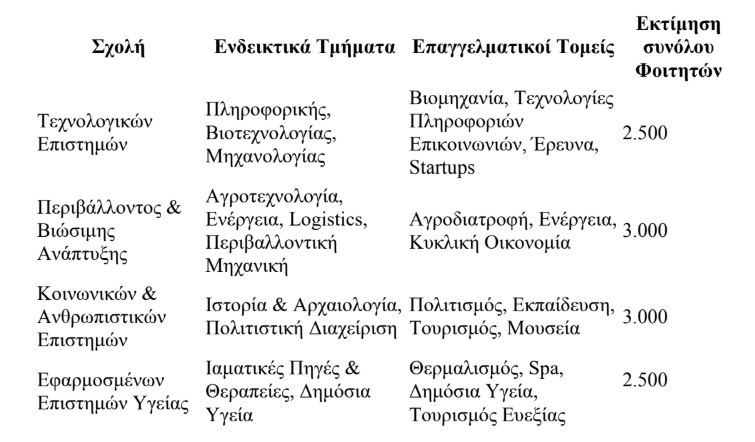 ∙ Δημιουργία νέων σχολών σε κρίσιμους τομείς όπως αγροτεχνολογία, πληροφορική, περιβάλλον, logistics, ενέργεια, βιοτεχνολογία, ιστορία, πολιτισμός.