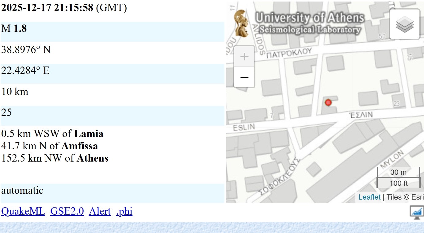 Ασθενής σεισμική δόνηση το βράδυ στη Λαμία