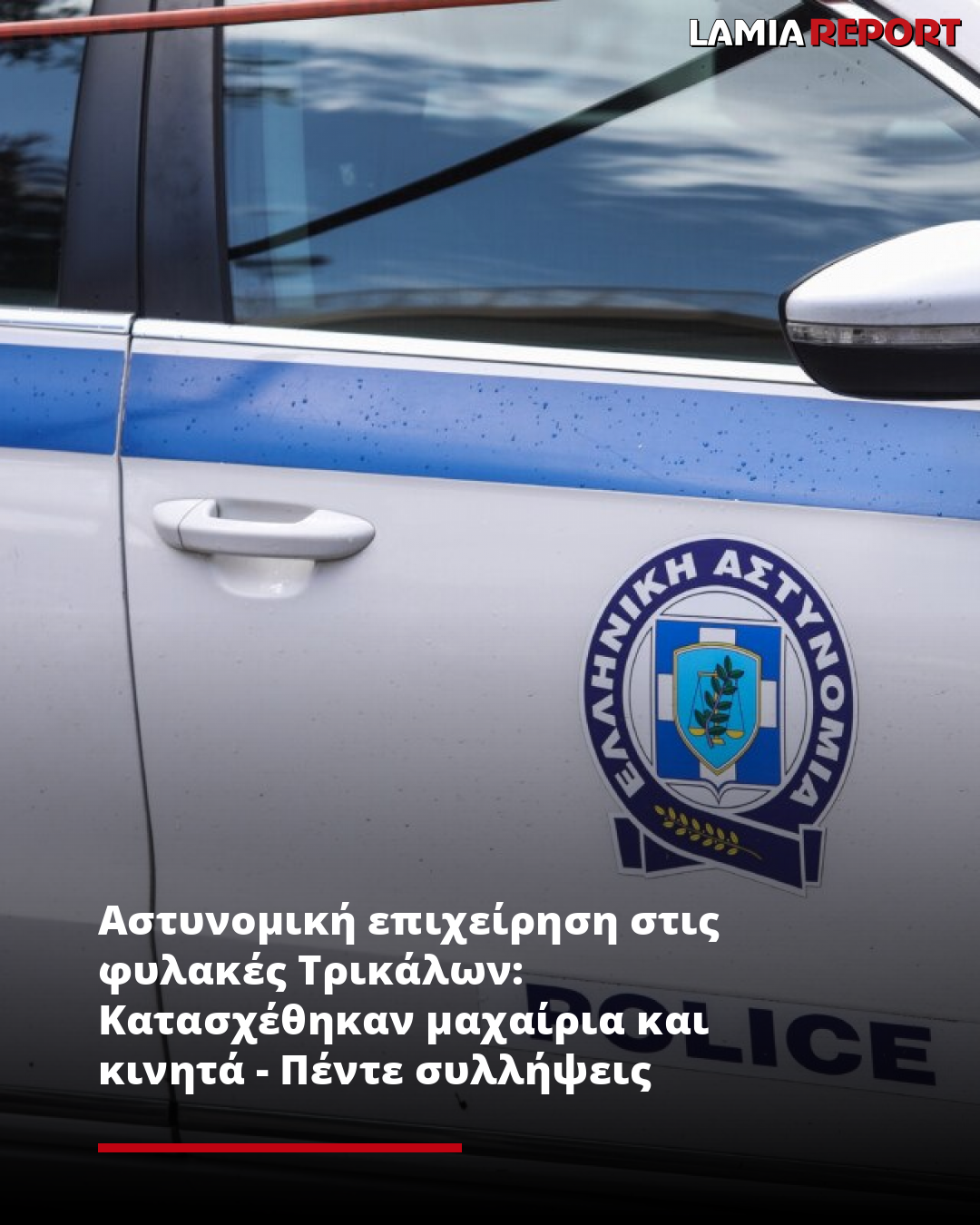 Αστυνομική επιχείρηση πραγματοποιήθηκε στις φυλακές Τρικάλων. Βρέθηκαν αυτοσχέδια μαχαίρια, κινητά και συνελήφθησαν πέντε κρατούμενοι.