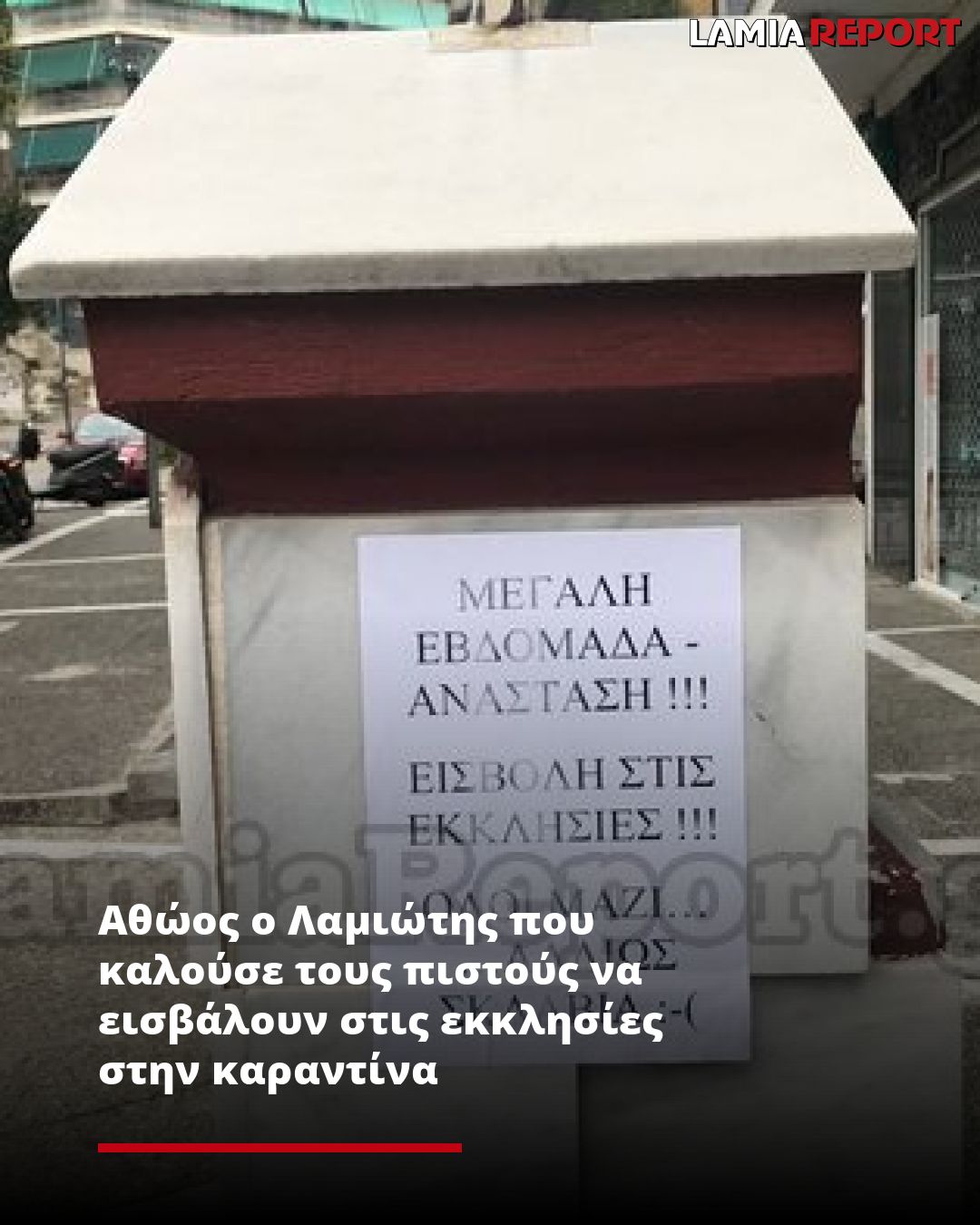 Αθώος κρίθηκε από το Μονομελές Πλημμελειοδικείο Λαμίας, 37χρονος Λαμιώτης ο οποίος τον Απρίλιο του 2020 τις ημέρες της 1ης καραντίνας λόγω κορωνοϊού, είχε κολλήσει σε δημόσιους χώρους χαρτιά που έγραφαν «Ανοιχτή εκκλησία - ελεύθερη Θεία Κοινωνία - Ανάσταση για όλους».