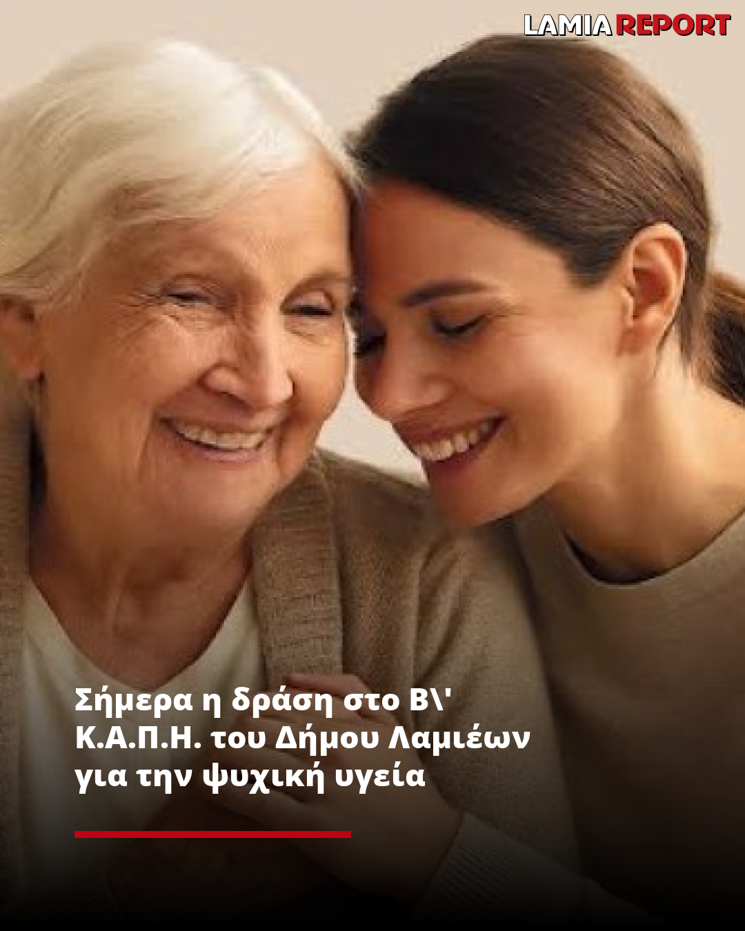 Στο πλαίσιο των δράσεων ευαισθητοποίησης και ενδυνάμωσης των δημοτών, την Πέμπτη 22 Μαΐου 2025 και ώρα 10:00 π.μ., στον χώρο του Β' Κ.Α.Π.Η. του Δήμου Λαμιέων, που βρίσκεται επί της οδού Αντιγόνης 2, θα πραγματοποιηθεί ένα βιωματικό εργαστήρι έκφρασης και σύνδεσης για την ψυχική ενδυνάμωση των ηλικιωμένων, με τίτλο «Η ψυχική υγεία μετράει... και μεγαλώνοντας!».