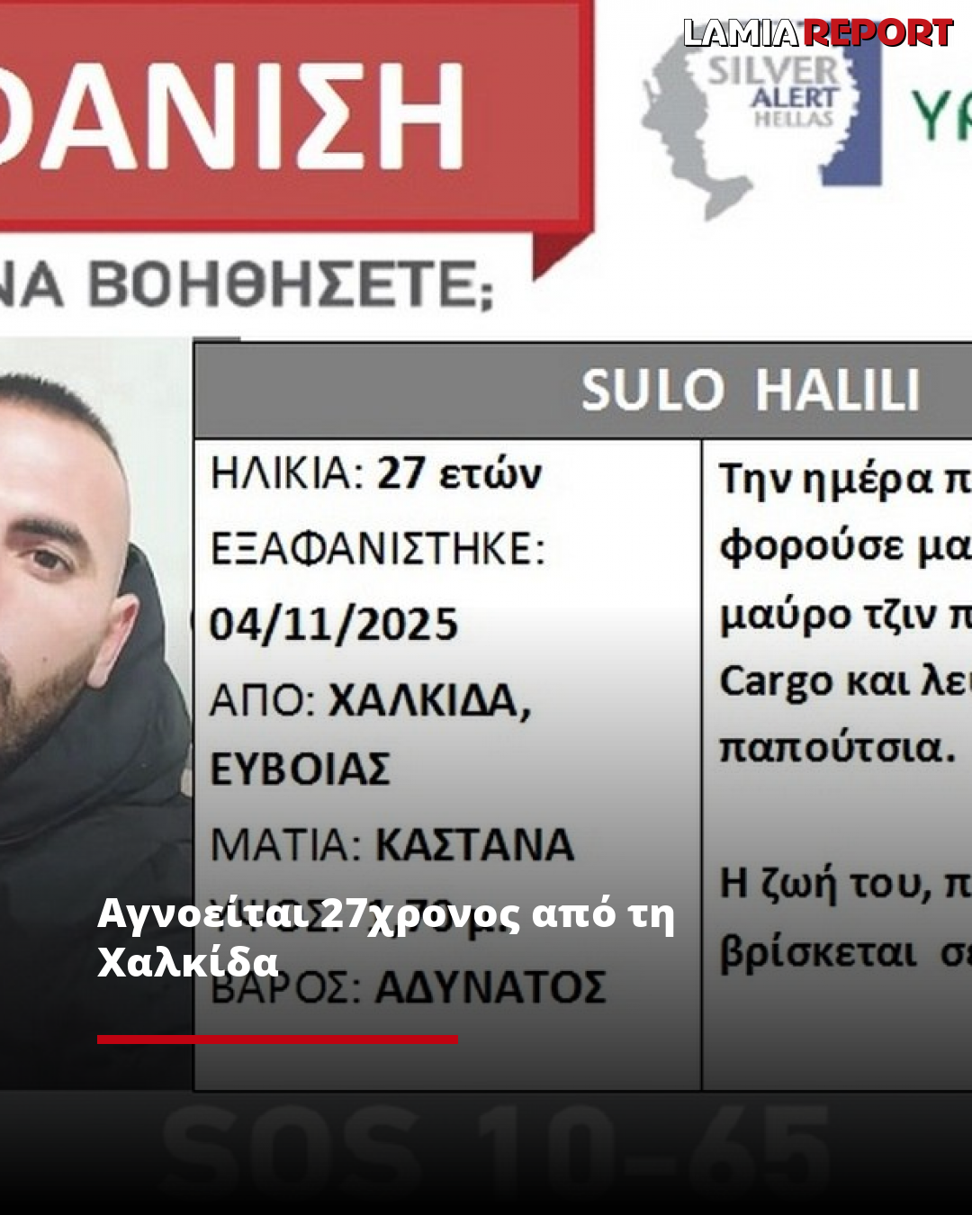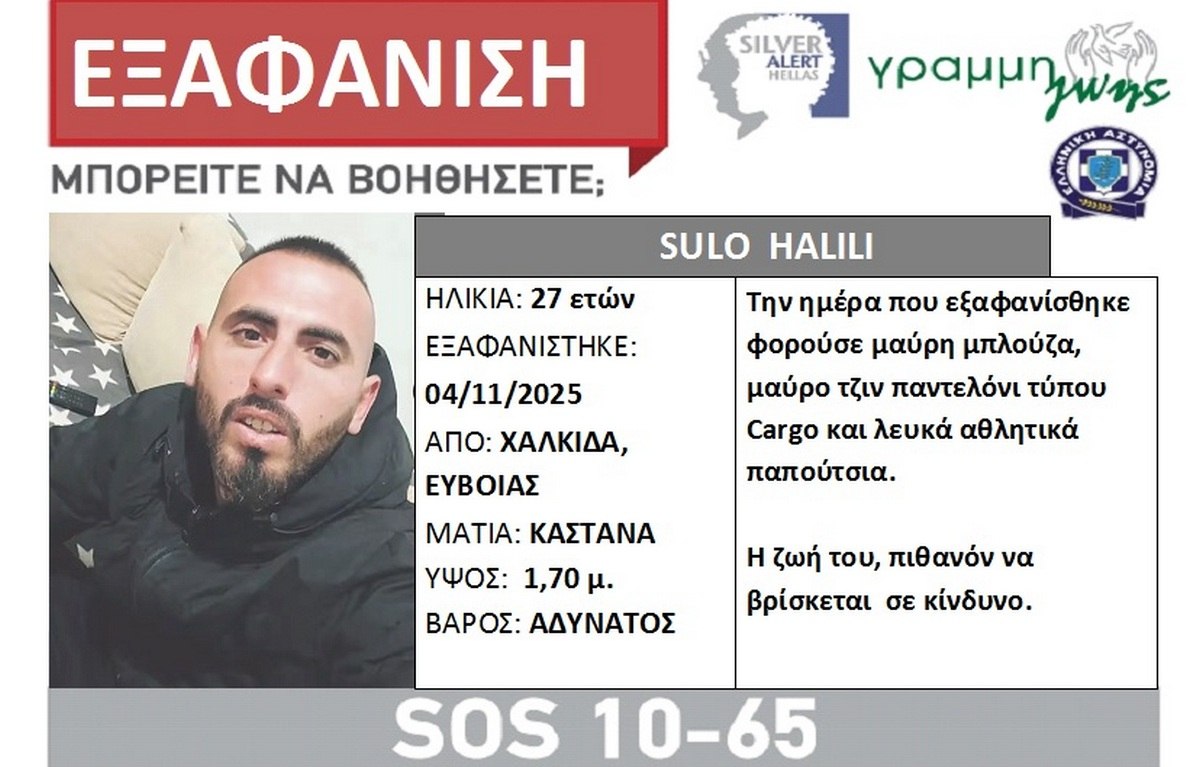 Silver Alert εκδόθηκε αργά τη νύχτα, ξημερώματα Δευτέρας 10 Νοεμβρίου 2025, για τον 27χρονο ΣΟΥΛΟ ΧΑΛΙΛΙ ο οποίος εξαφανίσθηκε από το σπίτι του, στη Χαλκίδα Εύβοιας, το απόγευμα της 04/11/25.