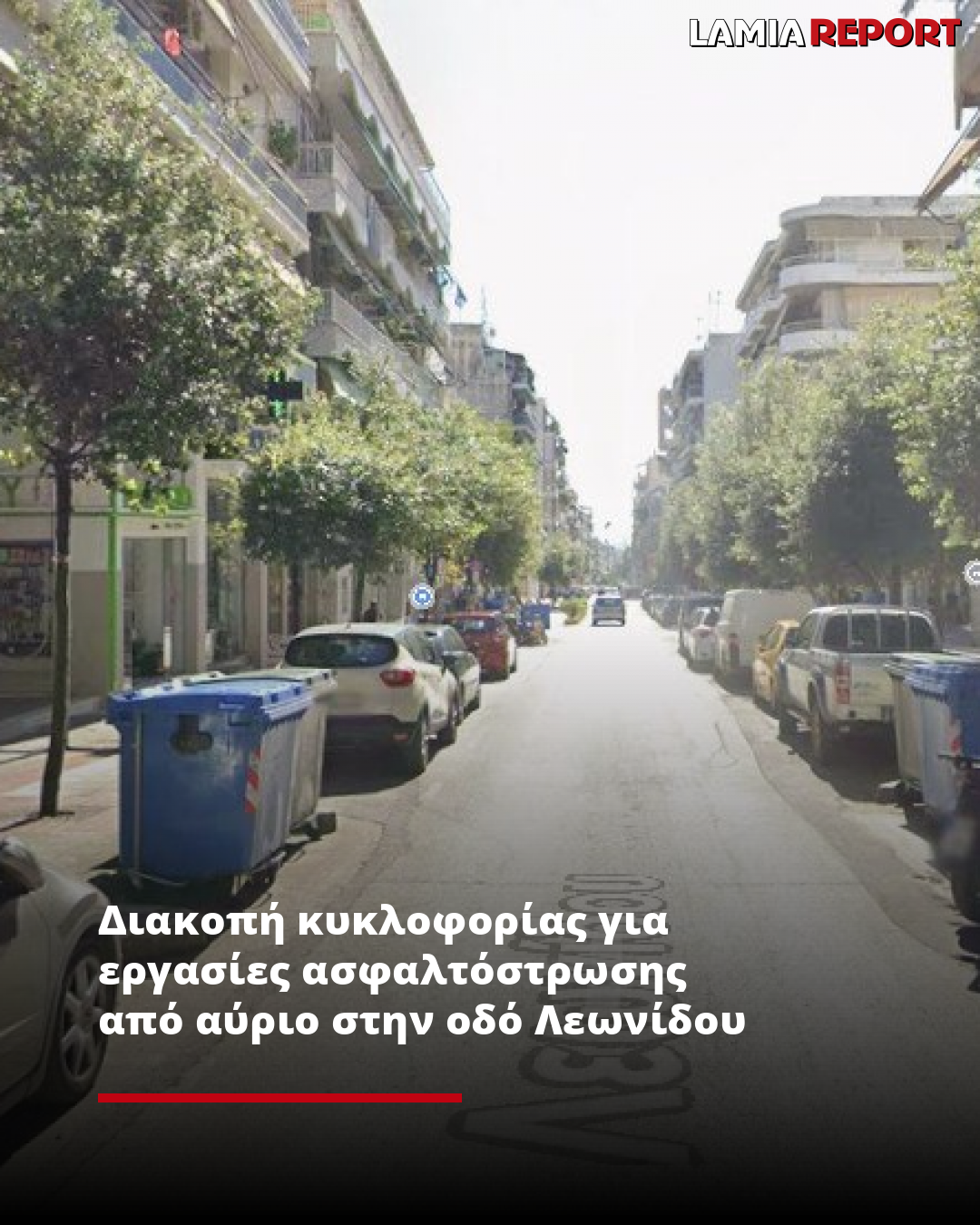 Η Διεύθυνση Υποδομών και Τεχνικών Έργων του Δήμου Λαμιέων ενημερώνει ότι, στο πλαίσιο κατασκευής του έργου «Αναβάθμιση βατότητας τμήματος οδού Λεωνίδου» θα εκτελεστούν εργασίες ασφαλτόστρωσης στο τμήμα της οδού Λεωνίδου, από τη διασταύρωσή της με την οδό Καποδιστρίου έως τη διασταύρωσή της με την οδό Παπακυριαζή.