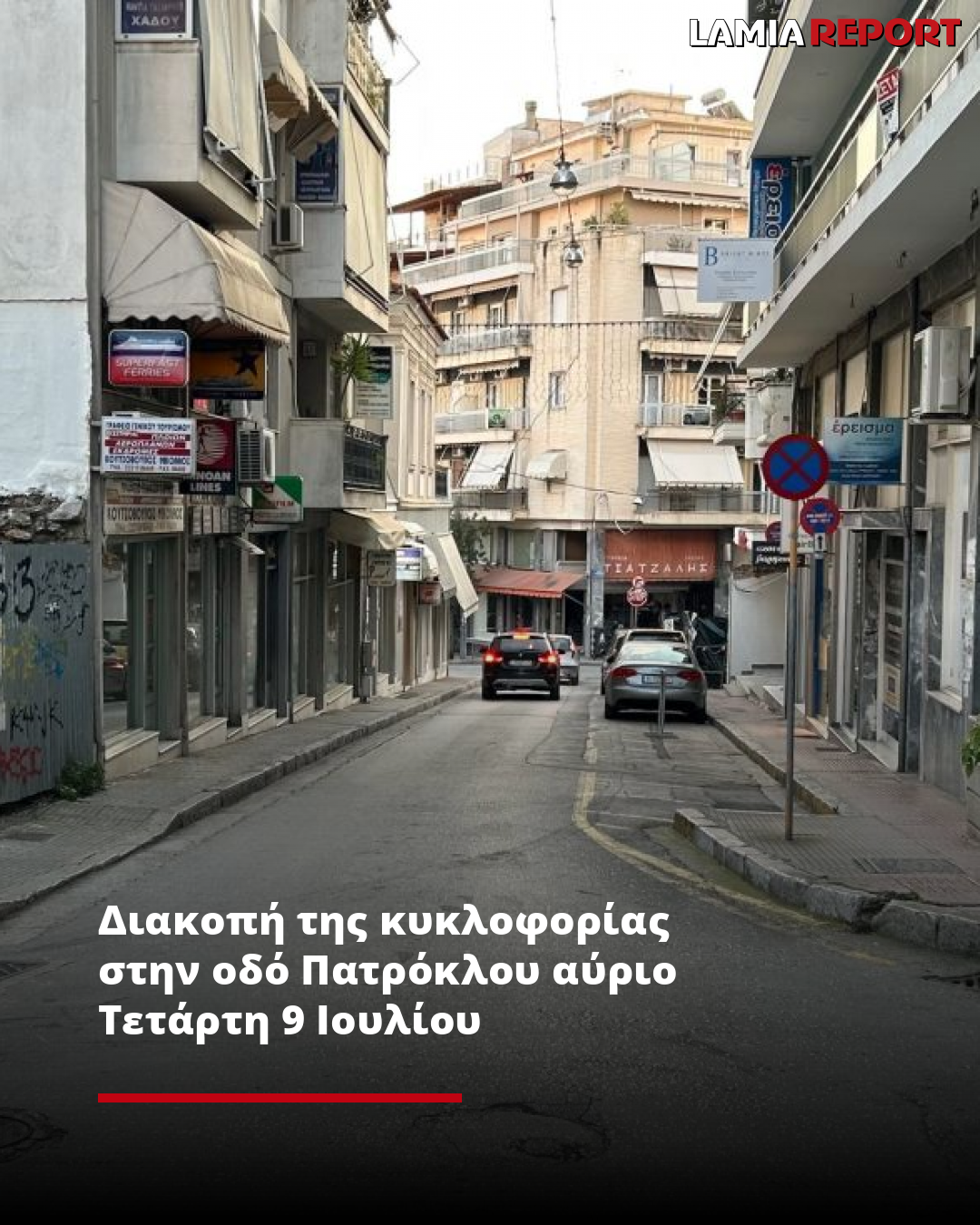 Η Διεύθυνση Υποδομών και Τεχνικών έργων του Δήμου Λαμιέων ενημερώνει ότι αύριο, Τετάρτη 9 Ιουλίου και από ώρα 08:00 π.μ. έως 10:00 π.μ., θα γίνει διακοπή της κυκλοφορίας των οχημάτων στην οδό Πατρόκλου, μεταξύ των οδών Δροσοπούλου και Σατωβριάνδου, για τη συνέχιση εργασιών σκυροδέτησης.