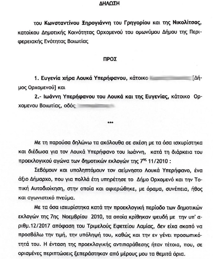 Δικαίωση για την οικογένεια του αείμνηστου Δημάρχου Ορχομενού και επιτίμου Προέδρου της Π.Ε.Δ. Στερεάς Ελλάδας Λουκά Υπερήφανου, μετά από δικαστικό αγώνα για την αποκατάσταση της τιμής και της υπόληψης με τη δημόσια δήλωση συγγνώμης του Κωνσταντίνου Ξηρογιάννη.