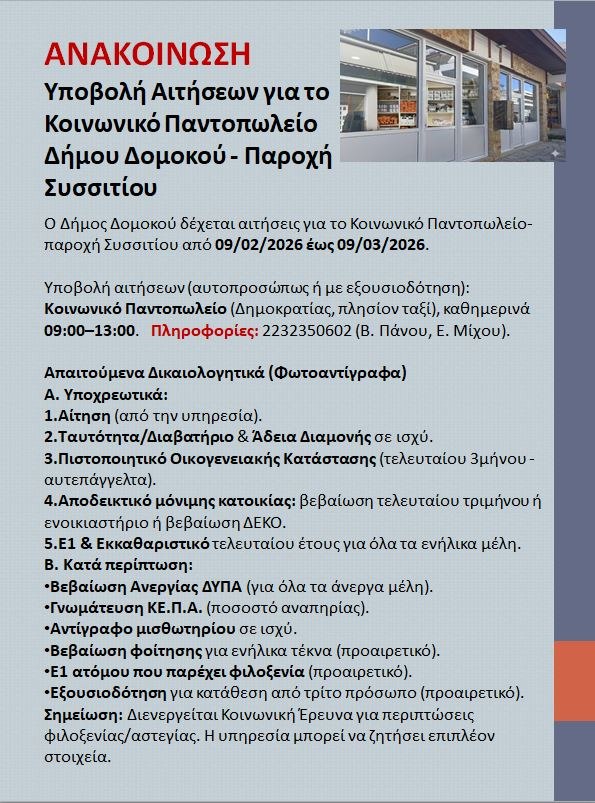 Ο Δήμος Δομοκού ανακοίνωσε ότι δέχεται αιτήσεις για το Κοινωνικό Παντοπωλείο- παροχή Συσσιτίου, από 09/02/2026 έως 09/03/2026.
