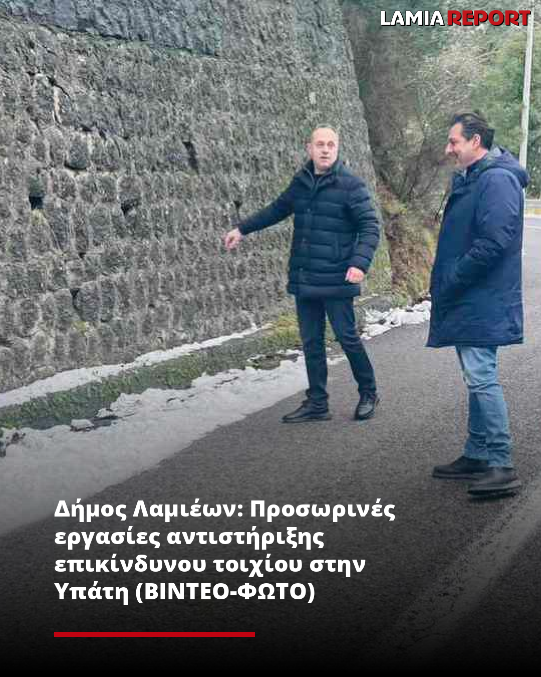Ο Δήμαρχος Λαμιέων Πανουργιάς Παπαϊωάννου, συνοδευόμενος από τον Αντιδήμαρχο Τεχνικών Έργων Γιώργο Ποντίκα, την Πρόεδρο της Δημοτικής Κοινότητας Υπάτης Βίκυ Παπανάγνου και εκπροσώπους του Υπουργείου Υποδομών και Μεταφορών, βρέθηκαν σήμερα Πέμπτη 22 Ιανουαρίου 2026, από τις πρώτες πρωινές ώρες στο σημείο των εργασιών παρακολουθώντας την εξέλιξή τους και εξέφρασε την ικανοποίησή του για την άμεση ανταπόκριση και την υλοποίηση της παρέμβασης, που ενισχύει την ασφάλεια κατοίκων και διερχόμενων οδηγών.
