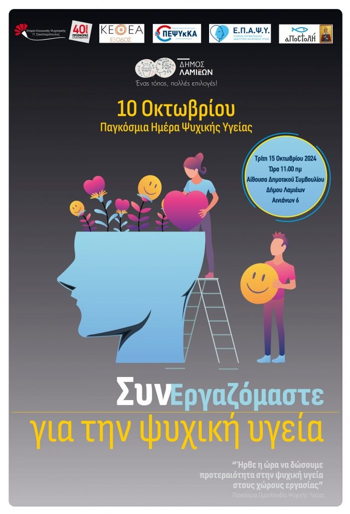 Ο Δήμος Λαμιέων, σε συνεργασία με την ΕΠΑΨΥ, ΠΕΨΥκΚΑ, Εταιρία Κοινωνικής Ψυχιατρικής Π. Σακελλαρόπουλος, «Αποστολή» & το ΚΕΘΕΑ - ΕΞΟΔΟΣ, εγκαινιάζουν την καμπάνια τους για την Παγκόσμια Ημέρα Ψυχικής Υγείας 2024, με κεντρικό μήνυμα «Συν-Εργαζόμαστε για την Ψυχική Υγεία».