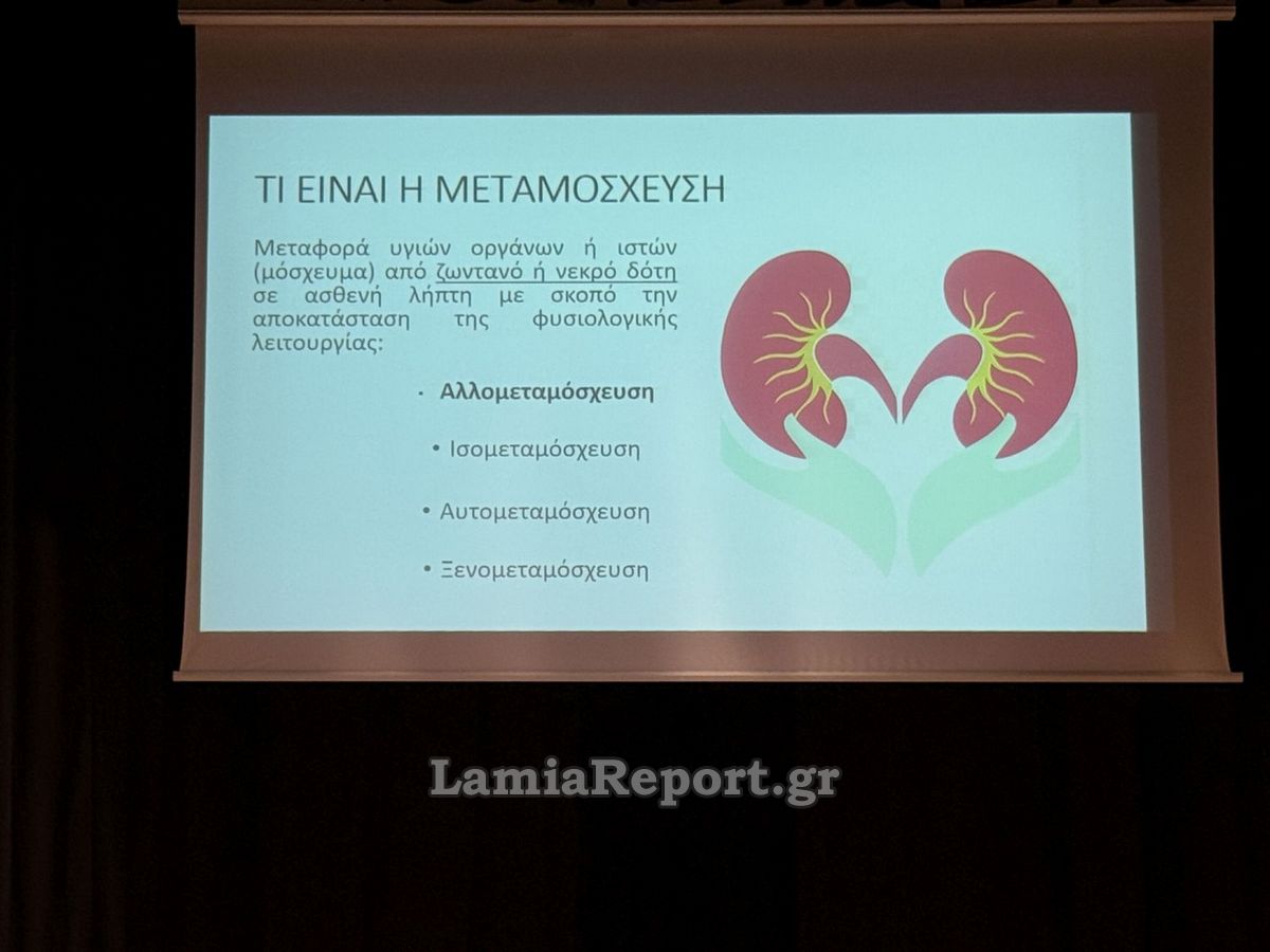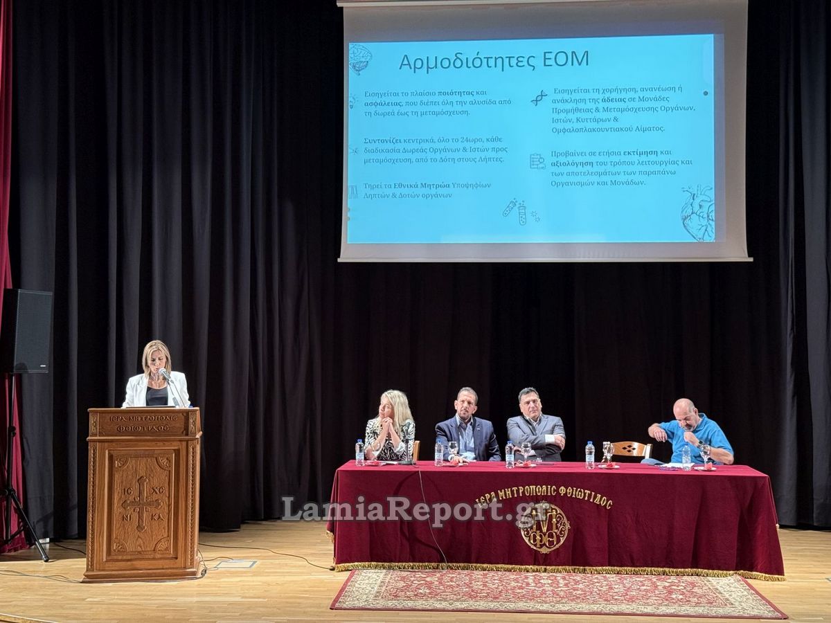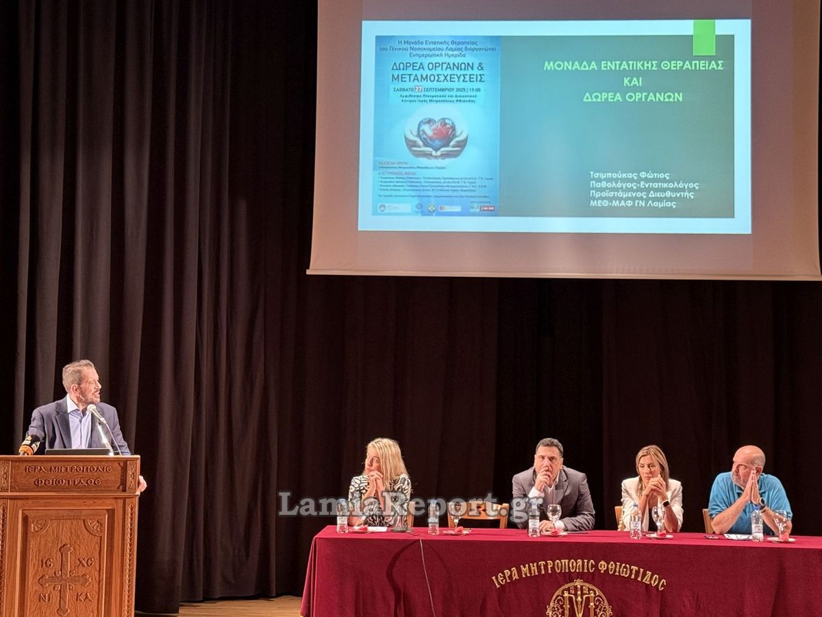 Η Μονάδα Εντατικής Θεραπείας (Μ.Ε.Θ.) του Γ.Ν. Λαμίας, υπό την αιγίδα της Ιεράς Μητροπόλεως Φθιώτιδας, του Ιατρικού Συλλόγου Φθιώτιδας και του Εθνικού Οργανισμού Μεταμοσχεύσεων (Ε.Ο.Μ.), παρουσίασε το θέμα «ΔΩΡΕΑ ΟΡΓΑΝΩΝ & ΜΕΤΑΜΟΣΧΕΥΣΕΙΣ».