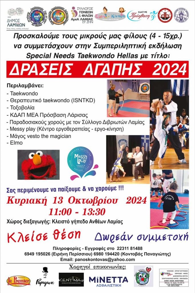 Ο Σύλλογος Γονέων και Φίλων ΑμεΑ Λαμίας ΕΥ ΖΗΝ , ο Διεθνές Φορέας TAEKWONDO ΑμεΑ ΕΛΛΑΣ και το Κέντρο Εργοθεραπείας Εργο – Κίνηση διοργανώνει την Κυριακή 13 Οκτωβρίου 2024 και ώρα 11:00 π.μ. στο κλειστό γυμναστήριο Ανθέων, την πρώτη συμπεριληπτική εκδήλωση ‘’Δράσεις Αγάπης 2024’’.