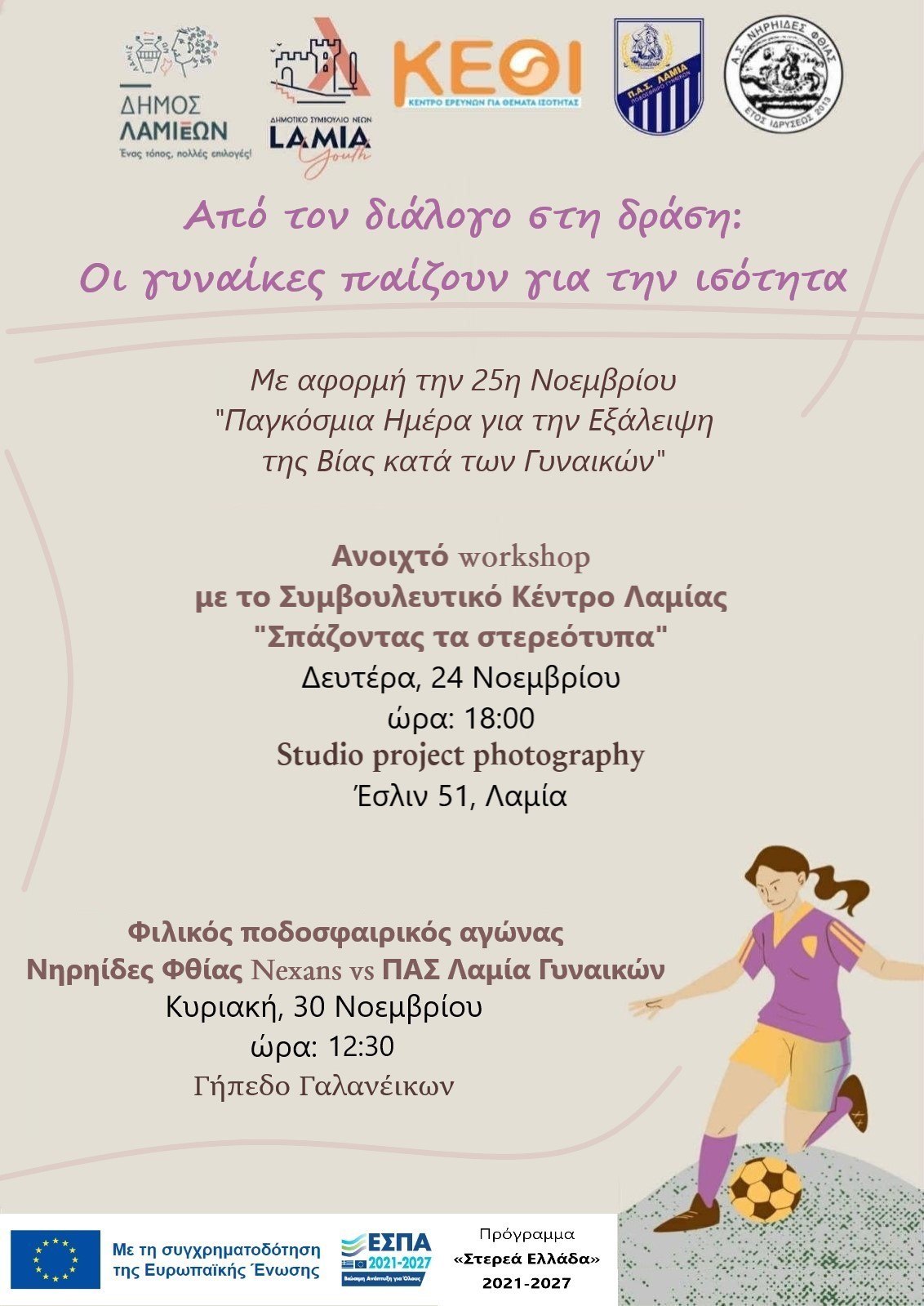 ⇒30/11/2025, ώρα 12:30: Συνδιοργάνωση με το Συμβούλιο Νέων Δήμου Λαμίας για τη διεξαγωγή φιλικού αγώνα ποδοσφαίρου μεταξύ των ομάδων «Νηρηίδες Φθίας Nexans» και «ΠΑΣ Λαμία Γυναικών», με στόχο την ευαισθητοποίηση, μέσω του αθλητισμού, σε θέματα έμφυλης βίας και διακρίσεων.