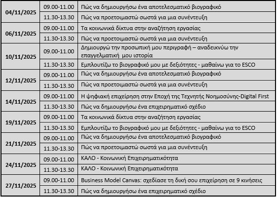 Για τα 18 Διαδικτυακά e-Εργαστήρια διάρκειας 2 ωρών θα πραγματοποιηθούν από εργασιακούς συμβούλους στις ημερομηνίες του παρακάτω πίνακα.