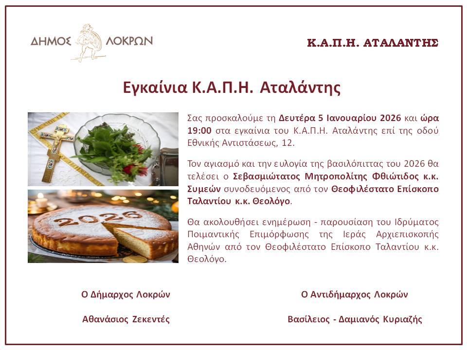 Ο Δήμος Λοκρών σάς προσκαλεί στα εγκαίνια των ΚΑΠΗ Αταλάντης.