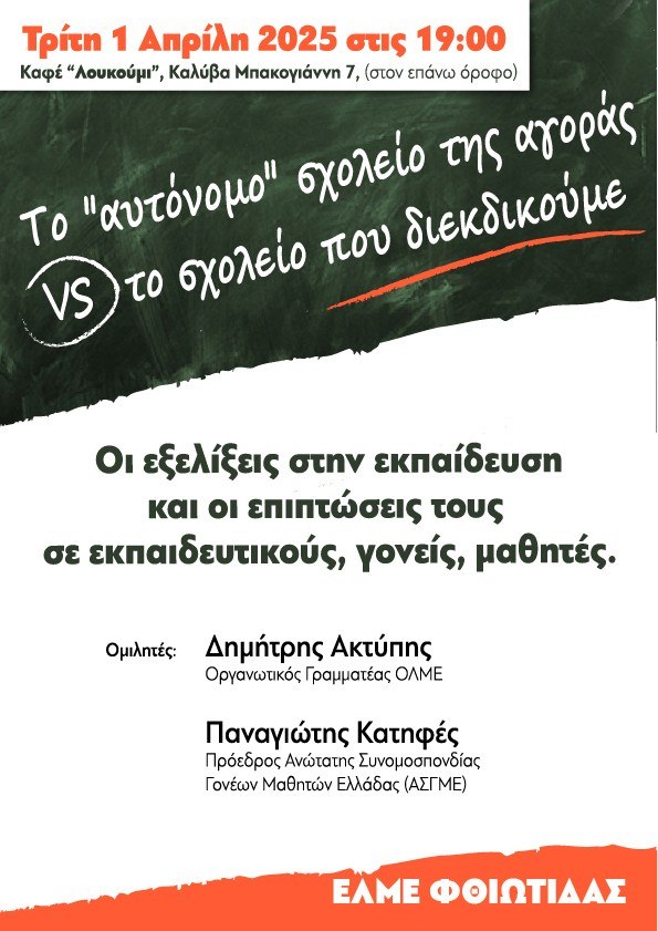 Οι εξελίξεις στην εκπαίδευση και οι επιπτώσεις τους σε εκπαιδευτικούς, γονείς και μαθητές, θα συζητηθούν στην εκδήλωση που διοργανώνει η ΕΛΜΕ Φθιώτιδας με τίτλο «Το ‘’αυτόνομο’’ σχολείο της αγοράς VS το σχολείο που διεκδικούμε».