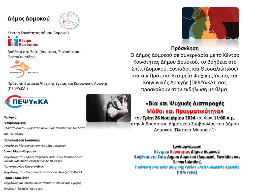 Η εκδήλωση με θέμα «Βία και Ψυχικές Διαταραχές - Μύθοι και Πραγματικότητα», που διοργανώνεται από τον Δήμο Δομοκού σε συνεργασία με το Κέντρο Κοινότητας, το πρόγραμμα «Βοήθεια στο Σπίτι» και την ΠΕΨΥκΚΑ Λαμίας, την Τρίτη 26 Νοεμβρίου στις 11:00 π.μ., στην αίθουσα του Δημοτικού Συμβουλίου Δομοκού (Πλατεία Μουσών 1), αναδεικνύει ένα εξαιρετικά επίκαιρο και σημαντικό ζήτημα: τη σχέση της βίας με τις ψυχικές διαταραχές.