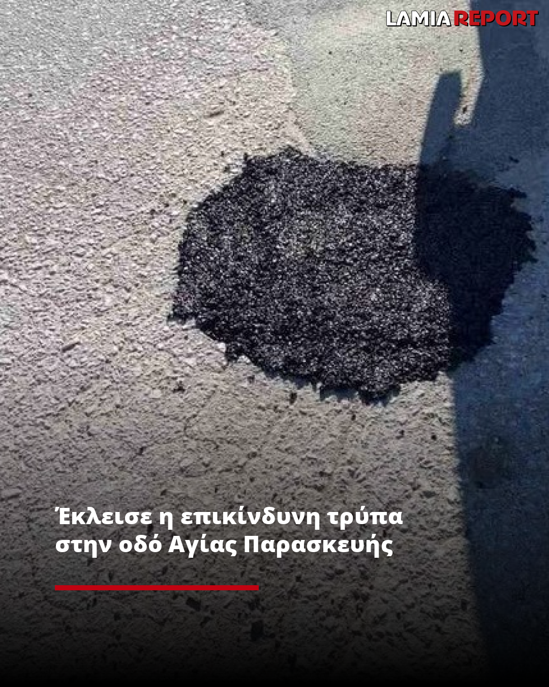 Ο Δήμος Λαμιέων επιμελήθηκε την τρύπα-παγίδα στην οδό Αγίας Παρασκευής, πριν τη συμβολή με την οδό Αλύτρωτων Πατρίδων.
