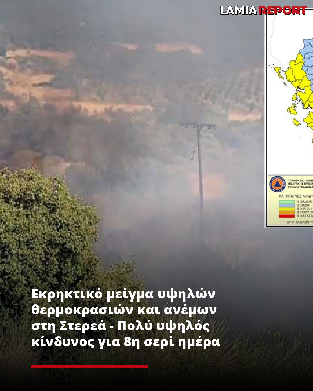 Μεταξύ αυτών και η Φθιώτιδα που βρίσκεται για 8η σερί ημέρα, όπως και το μεγαλύτερο μέρος της Στερεάς σε κατηγορία κινδύνου εκδήλωσης πυρκαγιάς «4» ή ακόμη και «5»!