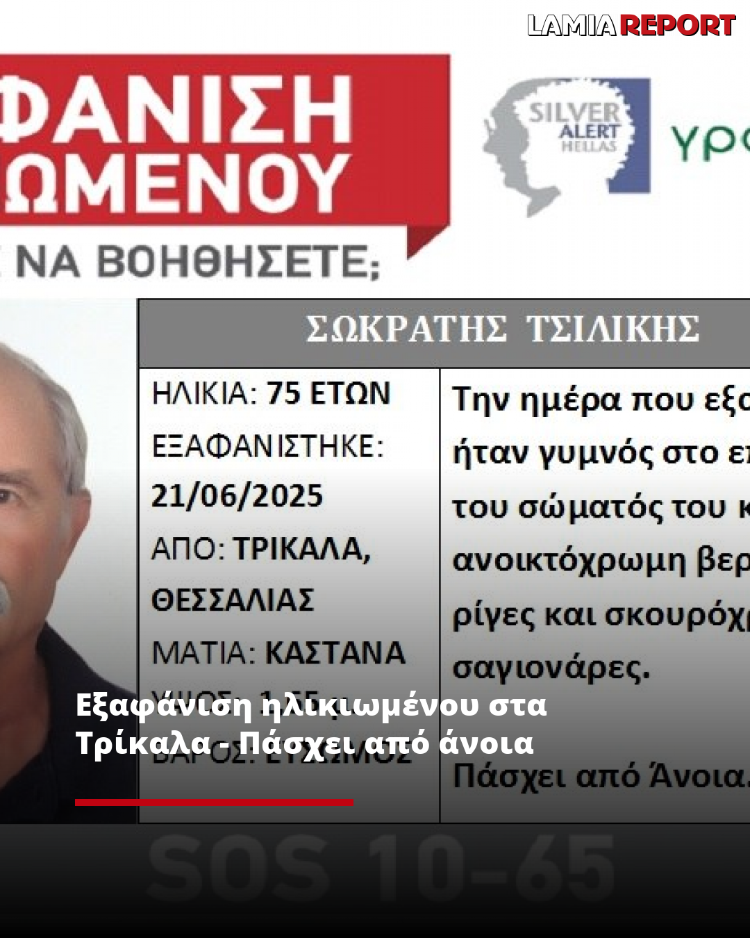 Έφυγε από το σπίτι του στα Τρίκαλα το μεσημέρι της 21/06/25 κι έκτοτε αγνοείται η τύχη του 75χρονου Σωκράτη Τσιλίκη.