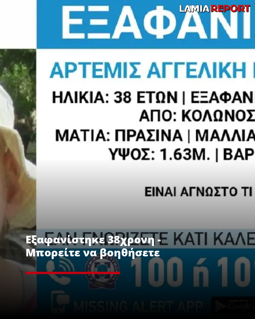 Μια γυναίκα 38 ετών η Άρτεμις - Αγγελική Προβοπούλου, εξαφανίστηκε από την περιοχή του Κολωνού.