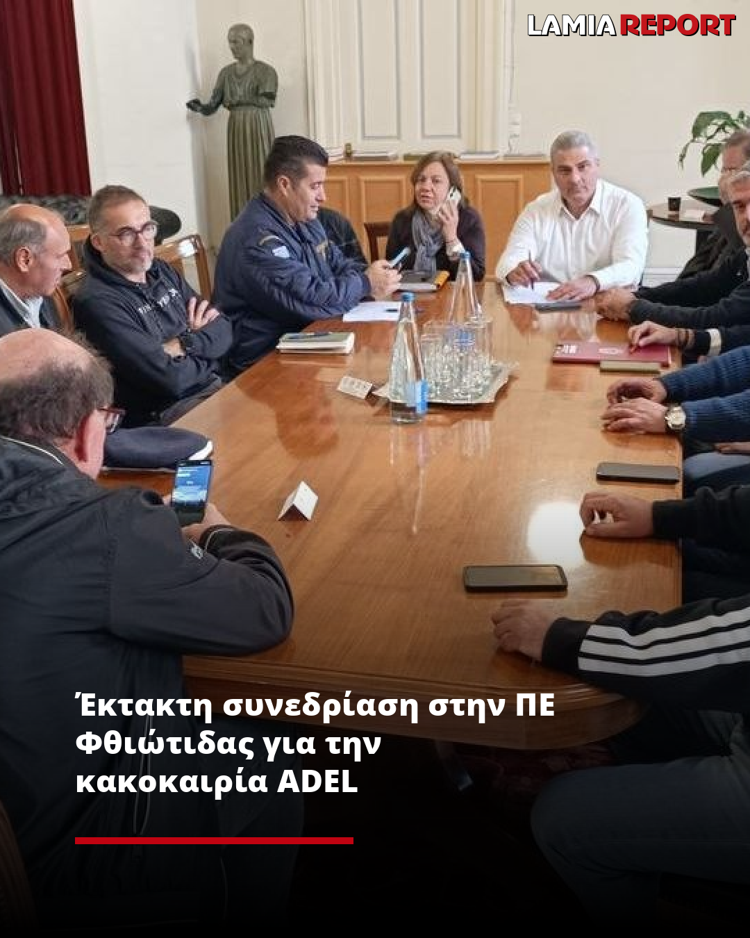 Πραγματοποιήθηκε, σήμερα Τετάρτη 26 Νοεμβρίου 2025, έκτακτη συνεδρίαση του ΠΕ.Σ.Ο.Π.Π. της Π.Ε. Φθιώτιδας από τον Αντιπεριφερειάρχη Φθιώτιδας Ηλία Κ. Σανίδα, στο γραφείο του στην Λαμία, με αντικείμενο τον προγραμματισμό μέτρων και δράσεων ενόψει της επερχόμενης κακοκαιρίας με το όνομα ADEL, η οποία αναμένεται να επηρεάσει και την Περιφερειακή Ενότητα Φθιώτιδας από απόψε, σύμφωνα με την 2η επικαιροποίηση του υπ. Αριθμ. 6/25-11-2025 Εκτάκτου Δελτίου ΕΠΙΔΕΙΝΩΣΗΣ ΚΑΙΡΟΥ (Ε.Δ.Ε.Κ.)