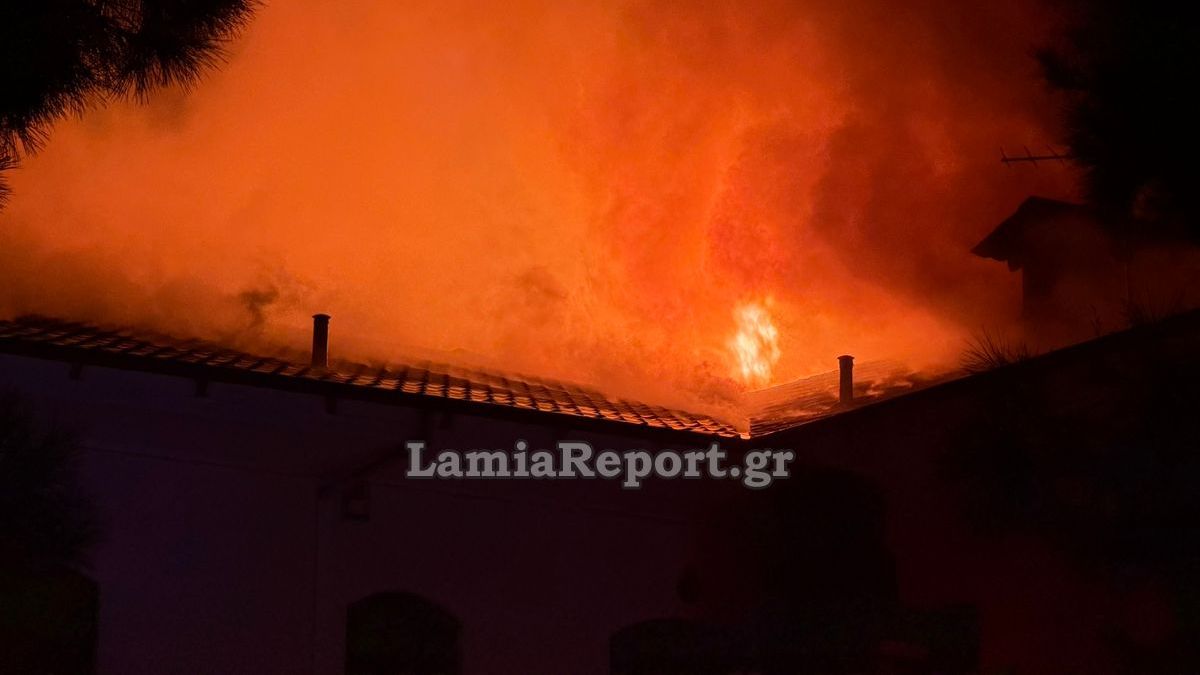 Μεγάλη προσπάθεια των πυροσβεστών να μην επεκταθεί η πυρκαγιά σε διπλανά σπίτια και κτίρια, καθώς και σε πεύκα που βρίσκονται δίπλα στο συγκρότημα.