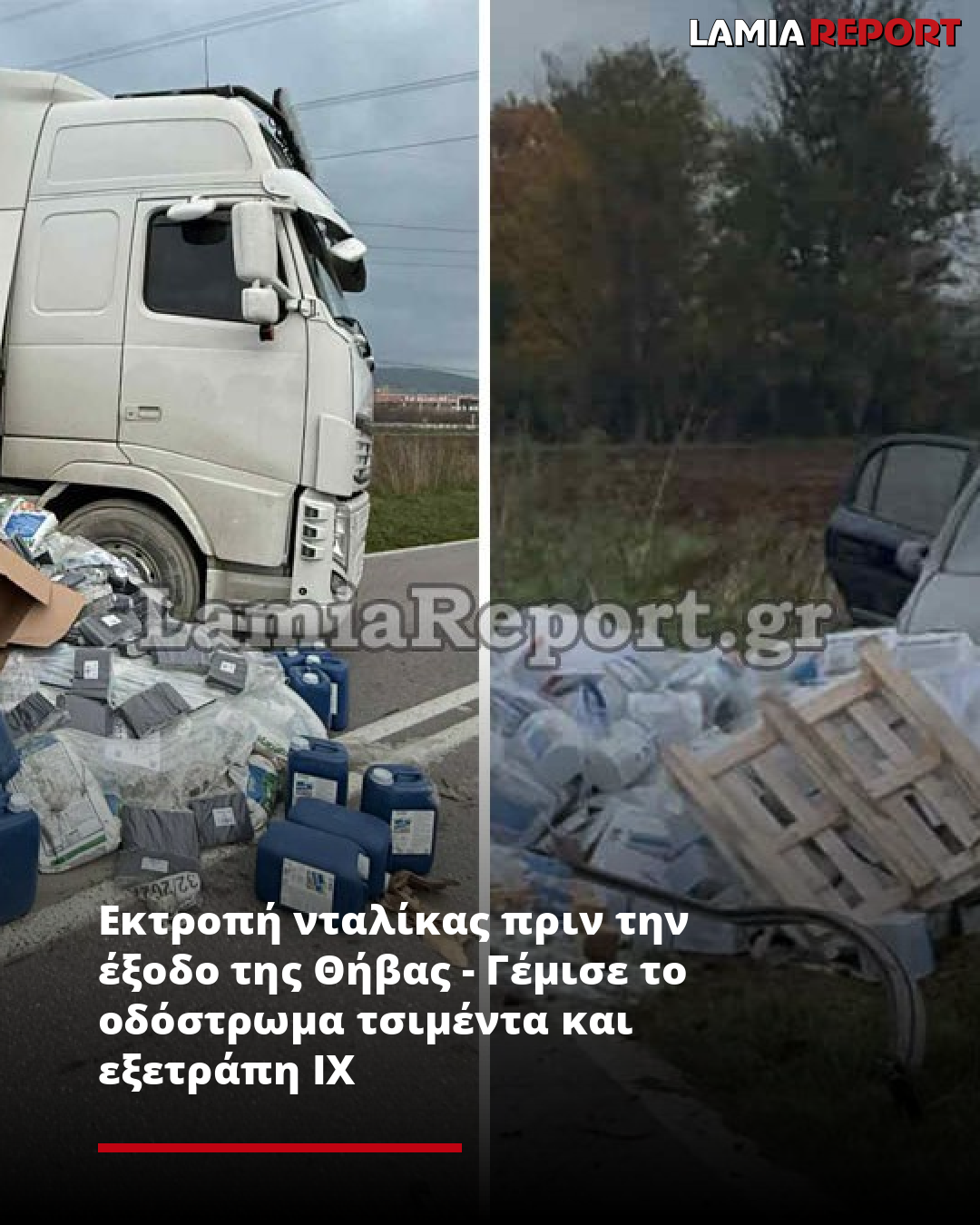 Σύμφωνα με τις πρώτες πληροφορίες του LamiaReport νταλίκα φορτωμένη με τσιμέντα και ορυκτά έλαια, για άγνωστη αιτία, εξετράπη της πορείας της με αποτέλεσμα να γεμίσει ο δρόμος με μέρος του φορτίου της. Αυτοκίνητο που προσπάθησε να αποφύγει τα εμπόδια βγήκε εκτός δρόμου και δύο από τους επιβάτες του μεταξύ αυτών και ένα μικρό παιδί, τραυματίστηκαν, ευτυχώς ελαφρά.