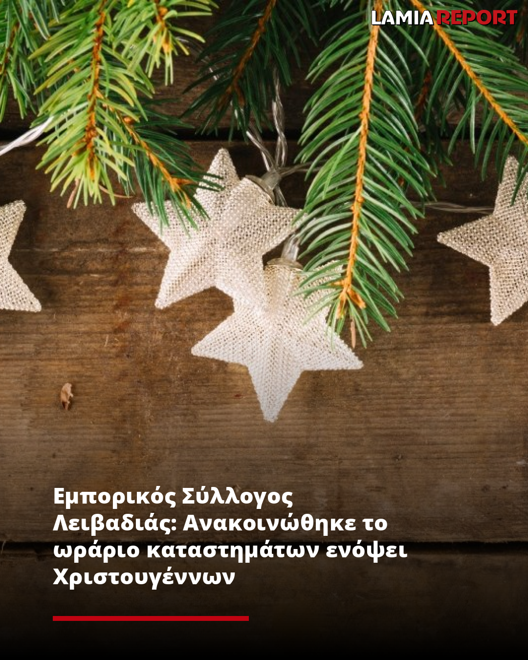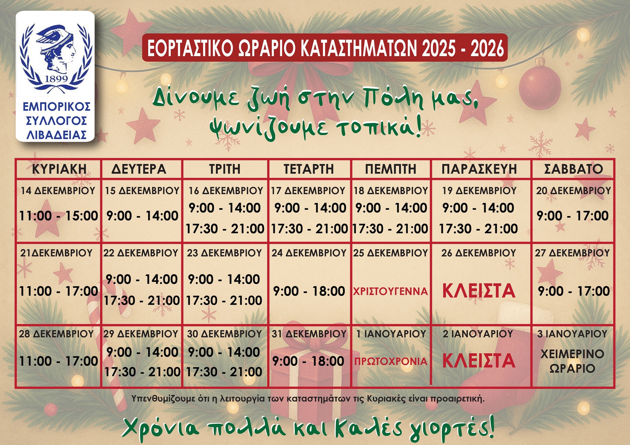 Ο Εμπορικός Σύλλογος Λιβαδειάς, μας ενημερώνει για το εορταστικό ωράριο των Χριστουγέννων, με το οποίο θα λειτουργήσουν τα καταστήματα.