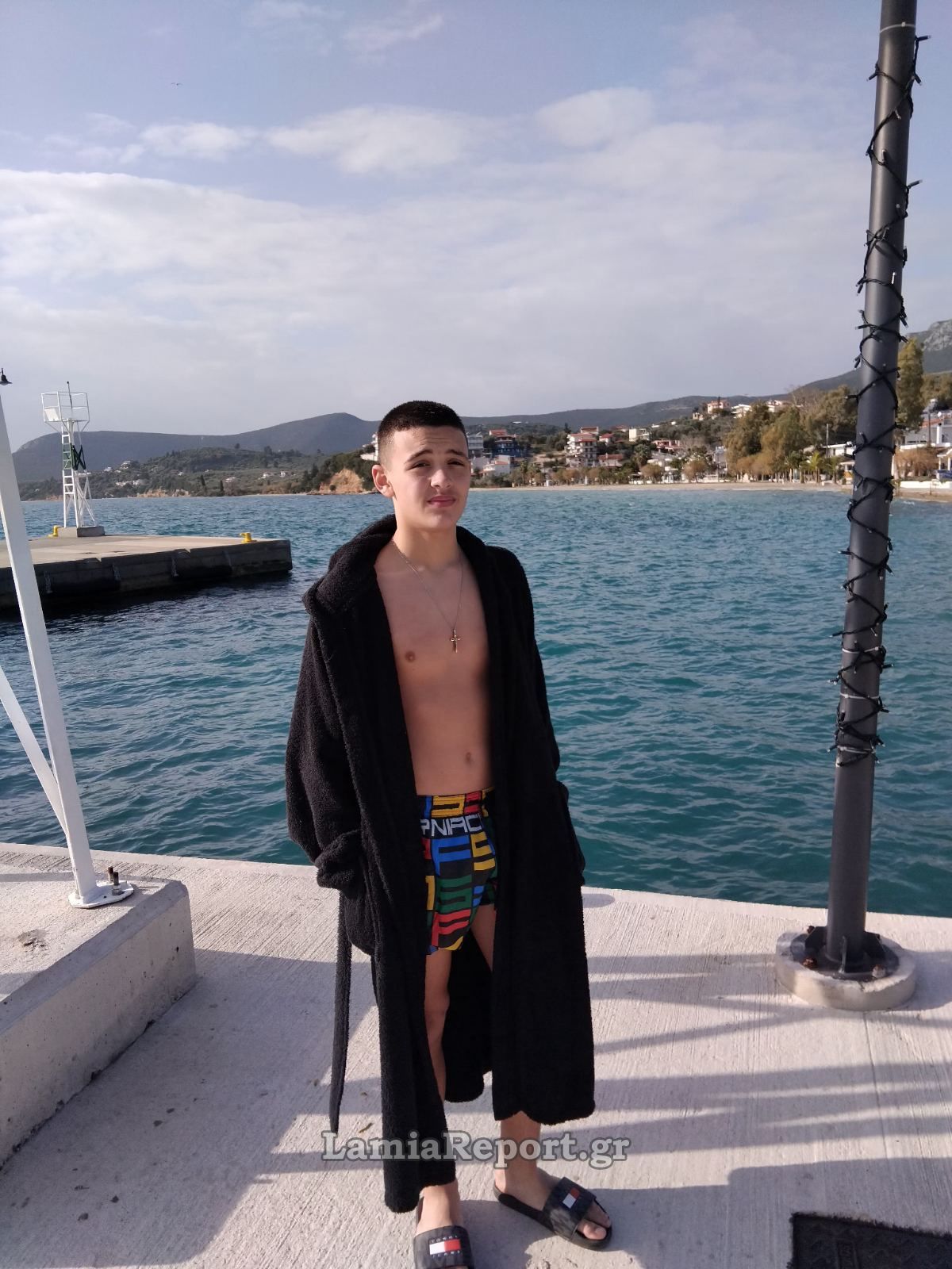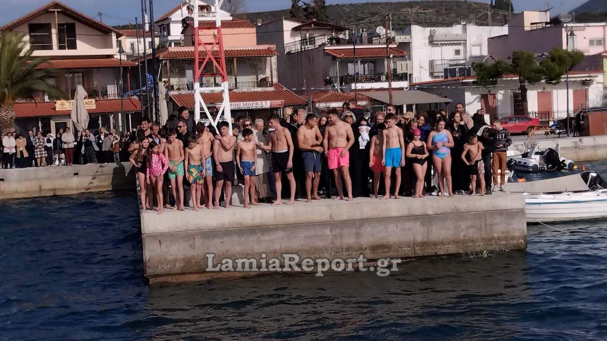 Παρά το δυνατό νοτιά που φυσούσε, πολλοί νέοι βούτηξαν στα καταγάλανα αλλά παγωμένα νερά για την ανάδυση του Τιμίου Σταυρού. Πρώτος ο 15χρονος μαθητής Ηρακλής Απ. Ζαρκαλής.