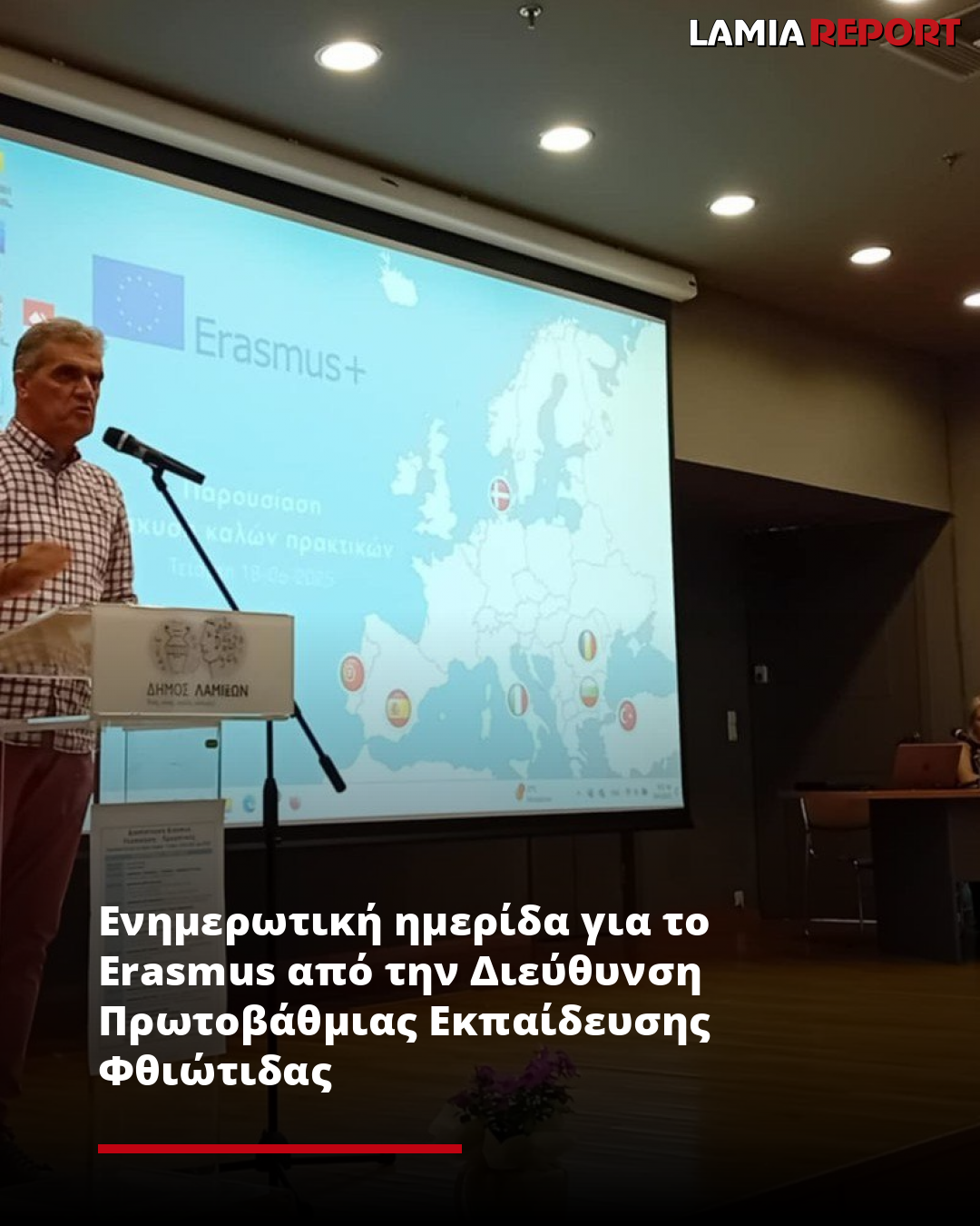 Την Τετάρτη 18 Ιουνίου 2025, στο Πολιτιστικό Κέντρο του Δήμου Λαμιέων, πραγματοποιήθηκε Ημερίδα που διοργάνωσε η Διεύθυνση Πρωτοβάθμιας Εκπαίδευσης (ΔΠΕ) Φθιώτιδας που είναι διαπιστευμένος φορέας για την υλοποίηση ευρωπαϊκών προγραμμάτων, με θέμα: Erasmus “Παρουσίαση - Διάχυση καλών πρακτικών».
