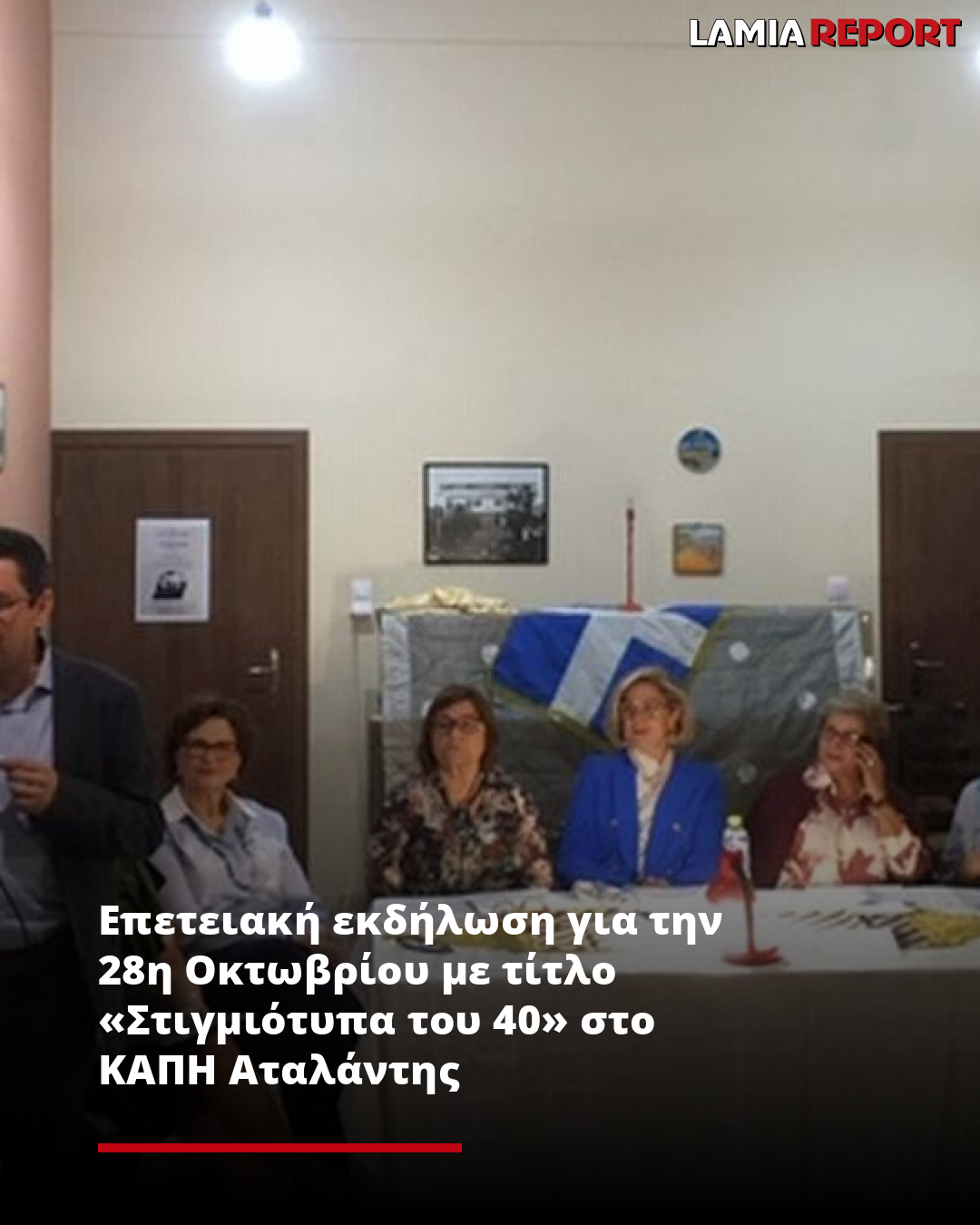 Στο πλαίσιο του εορτασμού της Εθνικής Επετείου της 28η Οκτωβρίου, ο Δήμος Λοκρών μέσω της Διεύθυνσης Κοινωνικής Προστασίας και Αλληλεγγύης και του ΚΑΠΗ Αταλάντης διοργάνωσε τη Δευτέρα 27 Οκτωβρίου 2025 εκδήλωση με τίτλο «Στιγμιότυπα του 40».