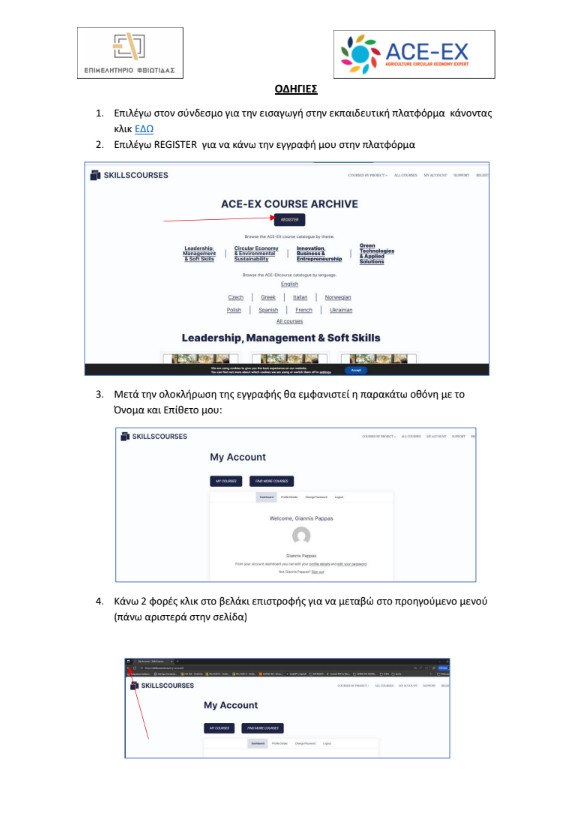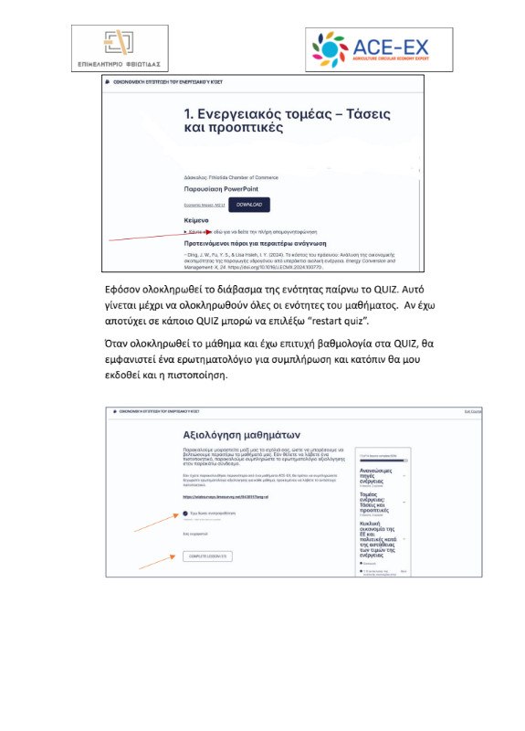 ο Επιμελητήριο Φθιώτιδας, στο πλαίσιο της ενεργούς συμμετοχής του σε ευρωπαϊκές πρωτοβουλίες που ενισχύουν την εκπαίδευση και την ανταγωνιστικότητα των μελών του, σας ενημερώνει για τη δυνατότητα δωρεάν παρακολούθησης εκπαιδευτικού προγράμματος στο πλαίσιο του ευρωπαϊκού έργου ACE-EX (Agriculture Circular Economy – Expert), που χρηματοδοτείται από το πρόγραμμα Erasmus+.