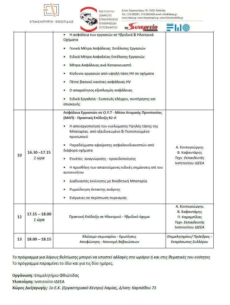 Με πρωτοβουλία του Επιμελητηρίου Φθιώτιδας, σε συνεργασία με το Ινστιτούτο Διαρκούς Επιμόρφωσης Επιχειρήσεων Αυτοκινήτου (ΙΔΕΕΑ), ξεκίνησε σήμερα Σάββατο 26 Απριλίου 2025 στο 1ο Εργαστηριακό Κέντρο Λαμίας, το διήμερο Τεχνικό Σεμινάριο που αφορά τις τάσεις στην αγορά των συνεργείων, την νομοθεσία, την ηλεκτροκίνηση, με έμφαση στις μελλοντικές εξελίξεις του κλάδου του αυτοκινήτου.