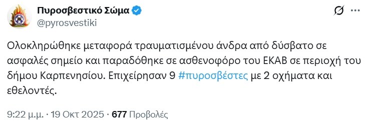 Σύμφωνα με τις πληροφορίες του LamiaReport, η βόλτα ενός άνδρα στο βουνό με το σκύλο του έληξε όταν τραυματίστηκε στο πόδι με αποτέλεσμα να μην μπορεί να επιστρέψει στο αυτοκίνητό του κοντά στη γέφυρα στα Διπόταμα. Άμεσα στήθηκε επιχείρηση με εννέα άνδρες από την Πυροσβεστική Υπηρεσία Καρπενησίου και επικεφαλής τον Υποδιοικητή της, Αντιπύραρχο Κωνσταντίνο Ζιάκα.