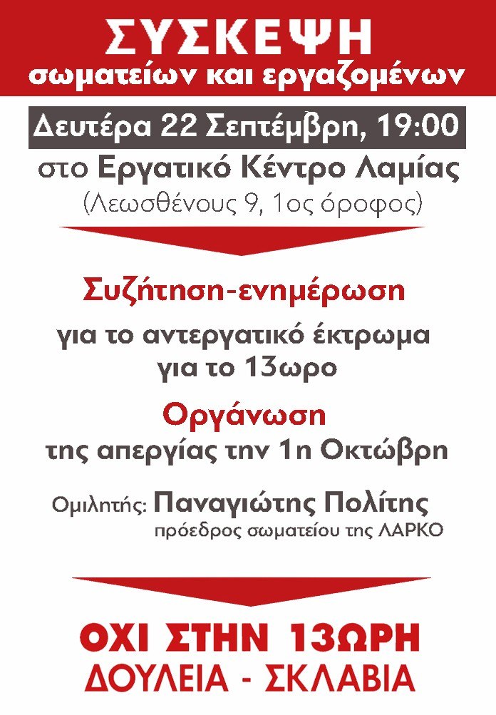 Το Εργατικό Κέντρο Λαμίας, καλεί τα σωματεία, τους εργαζόμενους και τις εργαζόμενες σε σύσκεψη την Δευτέρα 22 Σεπτεμβρίου στις 7:00 το απόγευμα στα γραφεία του (Λεωσθένους Δεδούση 9), «για την οργάνωση της απεργίας την 1η Οκτώβρη και του αγώνα μας ενάντια στο νομοσχέδιο – έκτρωμα της κυβέρνησης για το 13ωρο και τα ευέλικτα ωράρια», αναφέρουν σε ανακοίνωση.