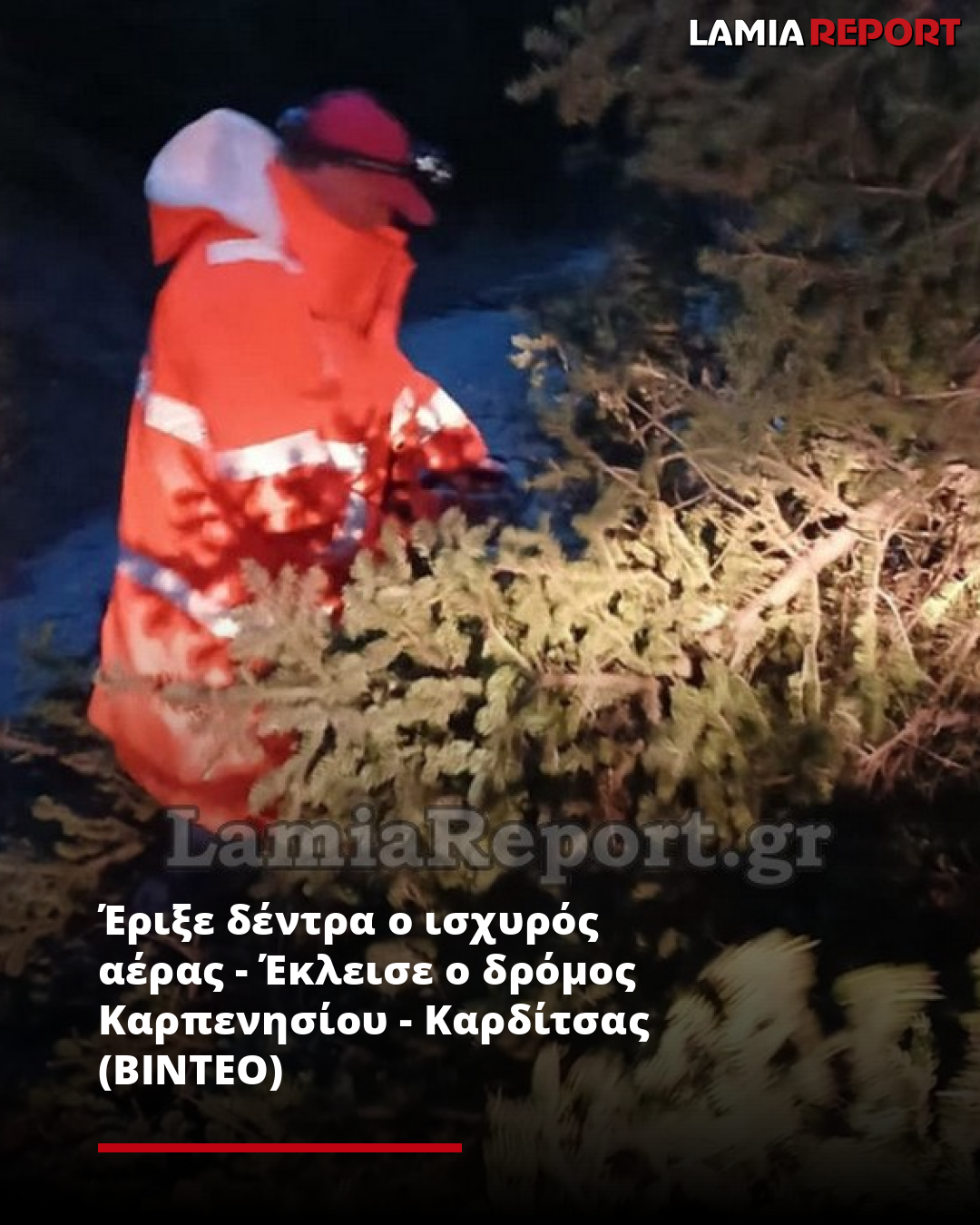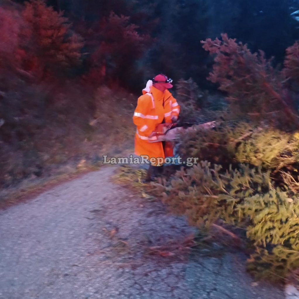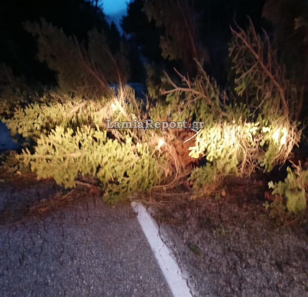 Συνέπεια των ισχυρών ανέμων ήταν έξι έλατα να πέσουν και να κλείσουν τον επαρχιακό δρόμο Καρπενησίου - Καρδίτσας.