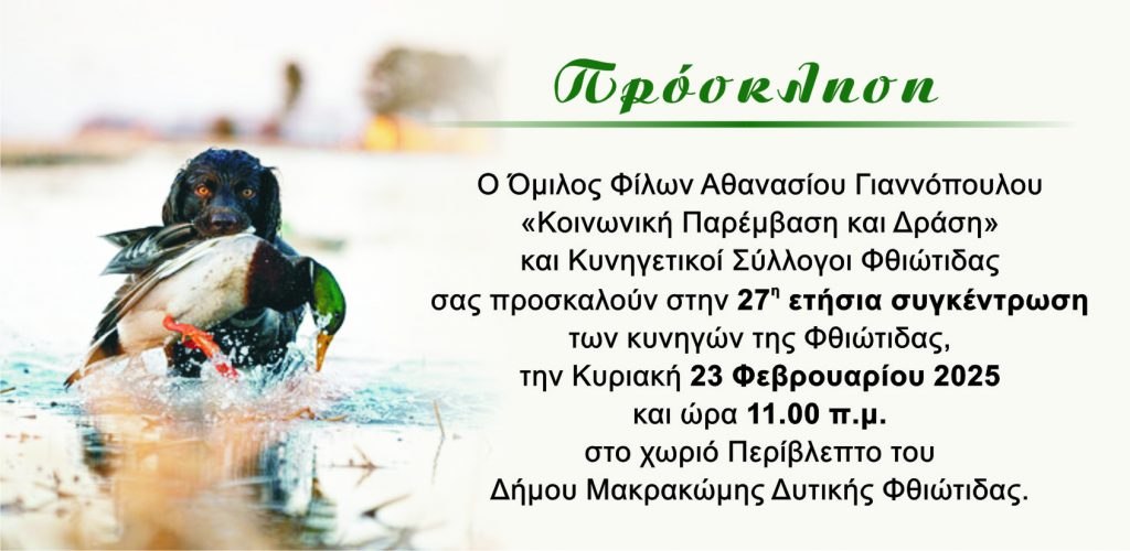 Η 27η ετήσια συγκέντρωση των κυνηγών της Φθιώτιδας, θα πραγματοποιηθεί όπως κάθε χρόνο την τελευταία Κυριακή του Φεβρουαρίου, στο Περίβλεπτο του Δήμου Μακρακώμης, σε μια πρωτοβουλία του Ομίλου Φίλων Αθανασίου Γιαννόπουλου "Κοινωνική Παρέμβαση και Δράση" και των Κυνηγετικών Συλλόγων Φθιώτιδας.
