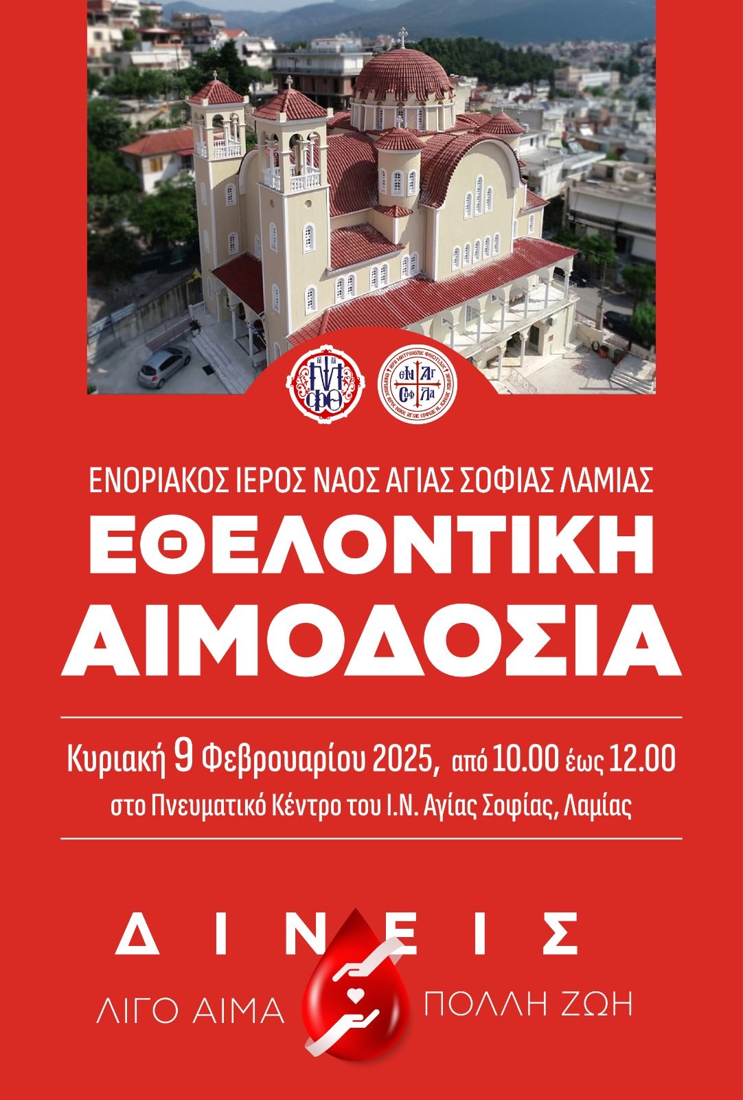 Στην προσπάθεια μας αυτή καλούμε όλους τους αιμοδότες, αλλά και όσους για πρώτη φορά θέλουν να βοηθήσουν στην προσπάθεια αυτή της τοπικής μας Εκκλησίας, να προσέλθουν την Κυριακή 9 Φεβρουαρίου 2025 στον Πνευματικό Κέντρο του Ιερού Ναού Αγίας Σοφίας Λαμίας, και να προσφέρουν αίμα.