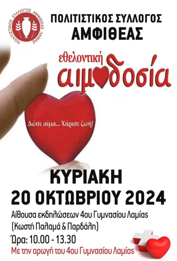 Πρόσκληση για εθελοντική αιμοδοσία από τον Πολιτιστικό Σύλλογο Αμφιθέας, με την αρωγή του 4ου Πειραματικού Γυμνασίου Λαμίας, την Κυριακή 20 Οκτωβρίου 2024.