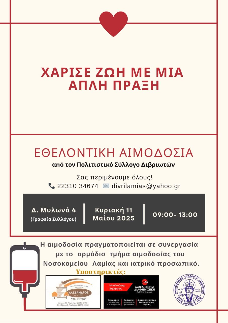 Ο Πολιτιστικός Σύλλογος Διβριωτών διοργανώνει εθελοντική αιμοδοσία την Κυριακή 11 Μαΐου 2025, από τις 09:00 έως τις 13:00, στα γραφεία του Συλλόγου (Δ. Μυλωνά 4, Λαμία).