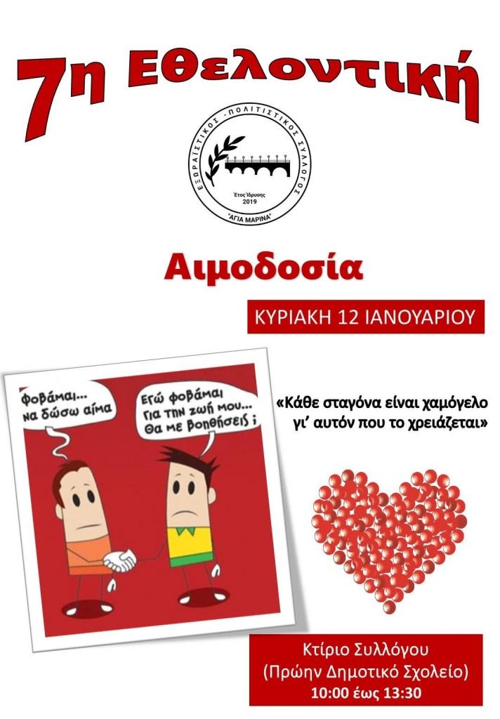 Ο Εξωραϊστικός Πολιτιστικός Σύλλογος "Αγία Μαρίνα" διοργανώνει εθελοντική αιμοδοσία.