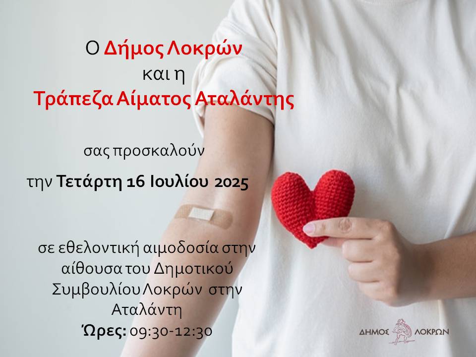 Ο Δήμος Λοκρών και η Τράπεζα Αίματος Αταλάντης διοργανώνουν εθελοντική αιμοδοσία!