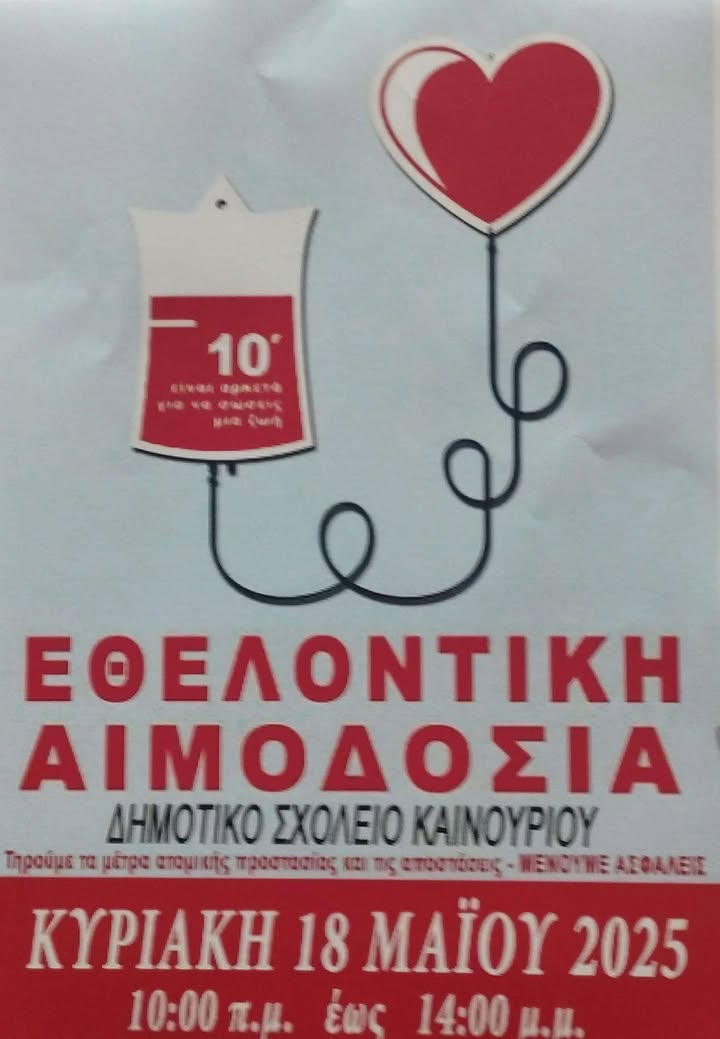Με βασικό μήνυμα «10' είναι αρκετά για να σώσεις μια ζωή», αύριο Κυριακή 18 Μαΐου 2025 από τις 10:00π.μ. μέχρι και τις 14:00μ.μ., πραγματοποιείται εθελοντική αιμοδοσία στο Καινούριο Φθιώτιδας.