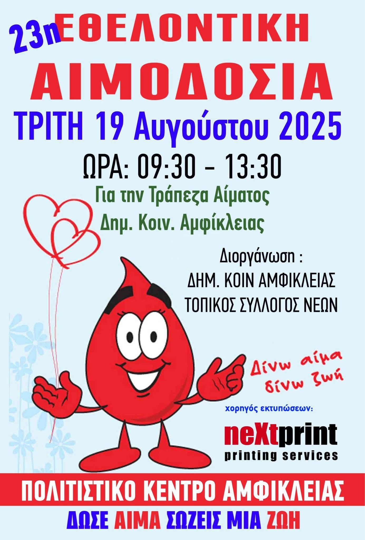 Η Δημοτική Κοινότητα Αμφίκλειας και ο Τοπικός Σύλλογος Νέων Αμφίκλειας διοργανώνουν και φέτος την 23η εθελοντική αιμοδοσία για την Τράπεζα Αίματος της Δημοτικής Κοινότητας, προωθώντας την ως πράξη προσφοράς και αλληλεγγύης.