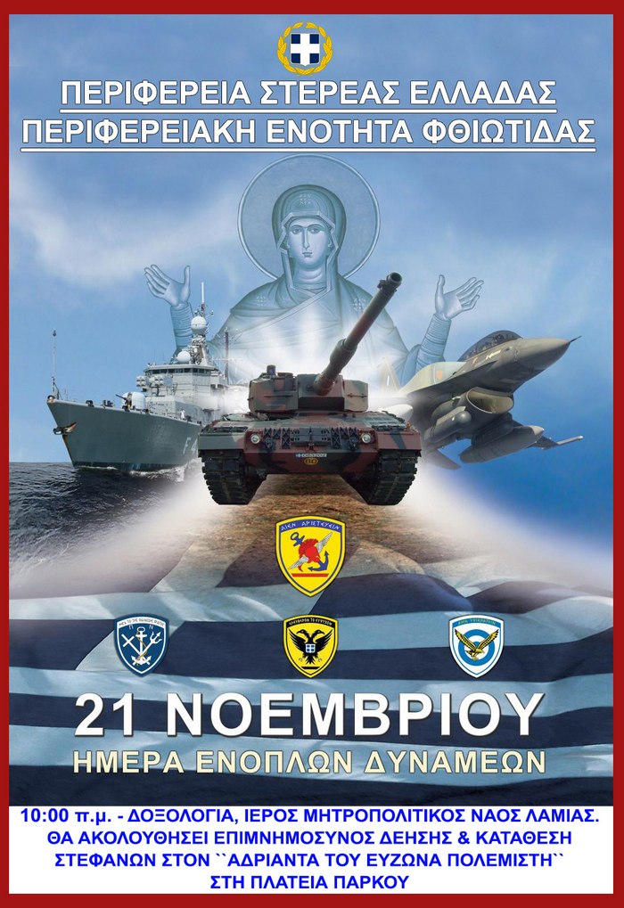 Με σημαιοστολισμό των Δημόσιων Καταστημάτων, ΝΠΔΔ και Ιδιωτικού Δικαίου, του Δημοτικού Καταστήματος, των οικιών και των ιδιωτικών καταστημάτων από την 8η πρωινή ώρα μέχρι τη δύση του ηλίου της Παρασκευής 21 Νοεμβρίου 2025, ξεκινούν οι εκδηλώσεις στη Λαμία, έδρα της Περιφέρειας Στερεάς Ελλάδας για τον εορτασμό της Ημέρας των Ενόπλων Δυνάμεων, ανήμερα των Εισοδίων της Θεοτόκου.
