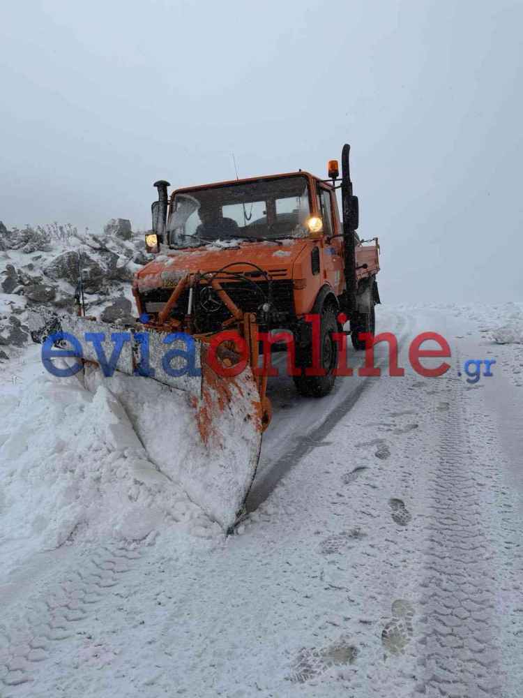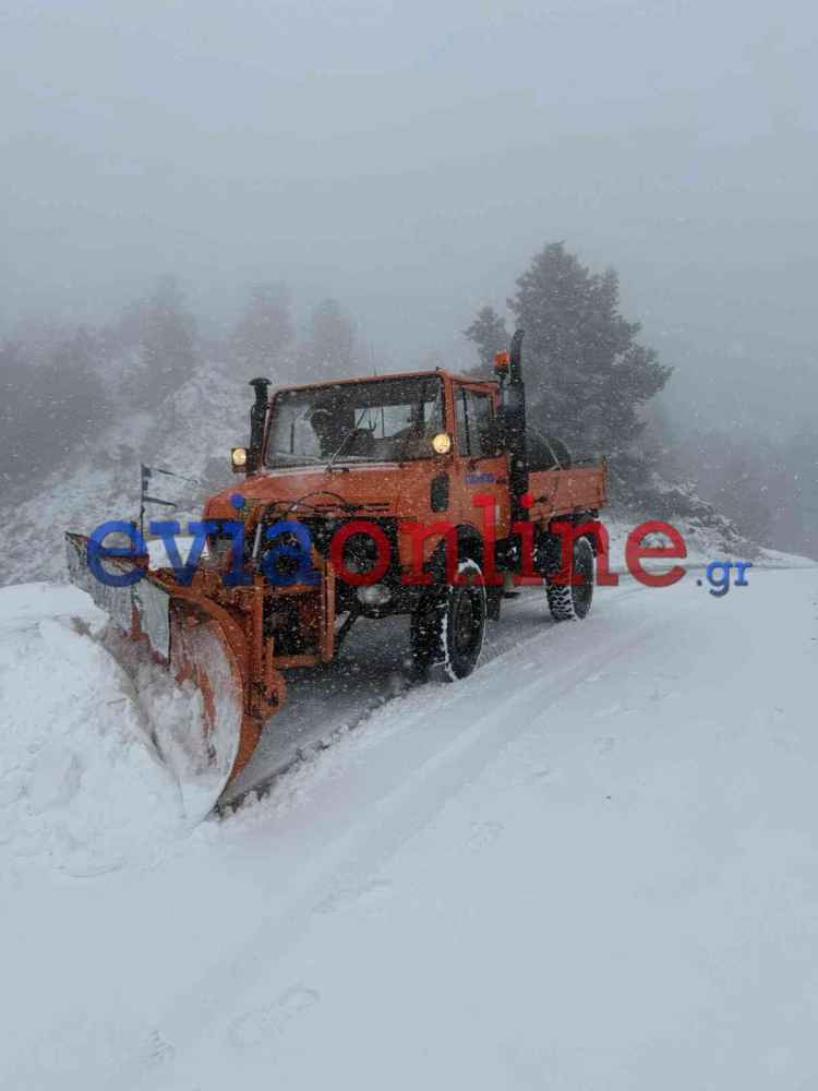 Μηχανήματα της περιφέρειας Στερεάς Ελλάδας και του Δήμου Διρφύων Μεσσαπίων βρίσκονται συνέχεια στους δρόμους και τους καθαρίζουν από το πυκνό χιόνι που πέφτει ασταμάτητα.