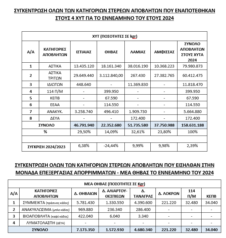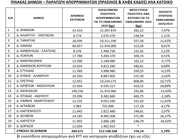- *Η ποσότητα ανά κάτοικο του Δήμου Δωρίδας δεν μπορεί να υπολογιστεί καθώς ο Δήμος εναποθέτει μέρος των απορριμμάτων του στον ΧΥΤ Άμφισσας.