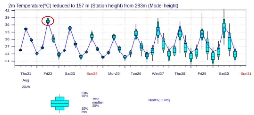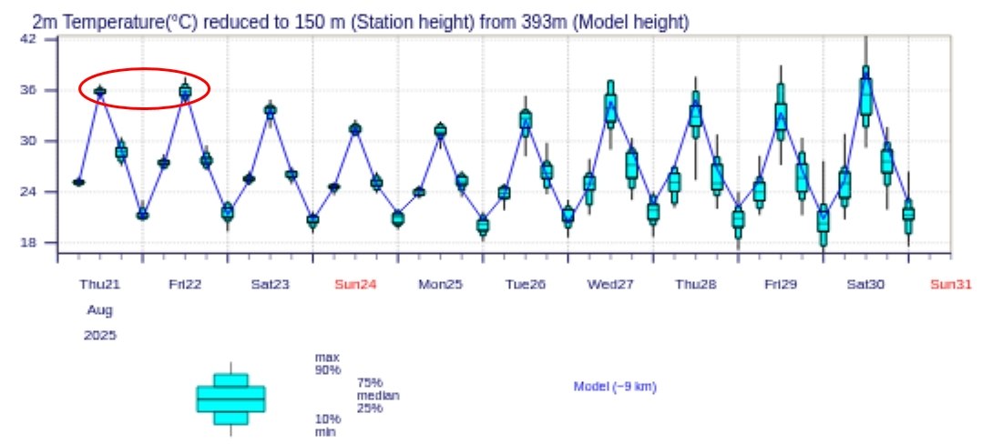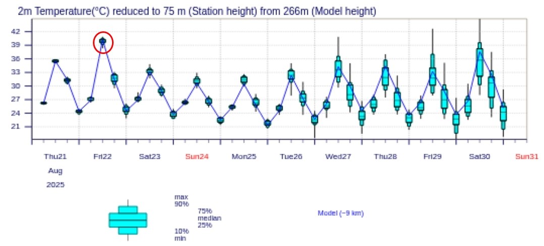 Παρακάτω παραθέτουμε τα μετεωγράμματα για περιοχές που δίνει το ECMWF στους δήμους της Φθιώτιδας. Έχουμε κυκλώσει την πρόβλεψη της μέγιστης τιμής για την πιο «δύσκολη ημέρα» του τελευταίου 10ημερου.