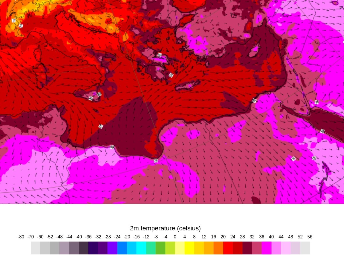 Ο χάρτης που ακολουθεί δείχνει τις θερμοκρασίες που αναμένονται μετά τις 12 το μεσημέρι της Παρασκευής στη χώρα μας, όπου διακρίνεται με ροζ χρώμα η Φθιώτιδα από τη Λαμία και κάτω μέχρι τη βορειοανατολική Αττική μαζί με τις δυτικές ακτές της κεντρικής Εύβοιας.