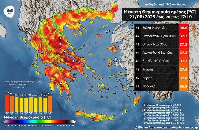 Δείτε και το χάρτη του meteo για τις περιοχές όπου καταγράφηκαν οι υψηλότερες θερμοκρασίες την Πέμπτη 21 Αυγούστου, με 5 από τα 8 σημεία στην Κεντρική Ελλάδα:
