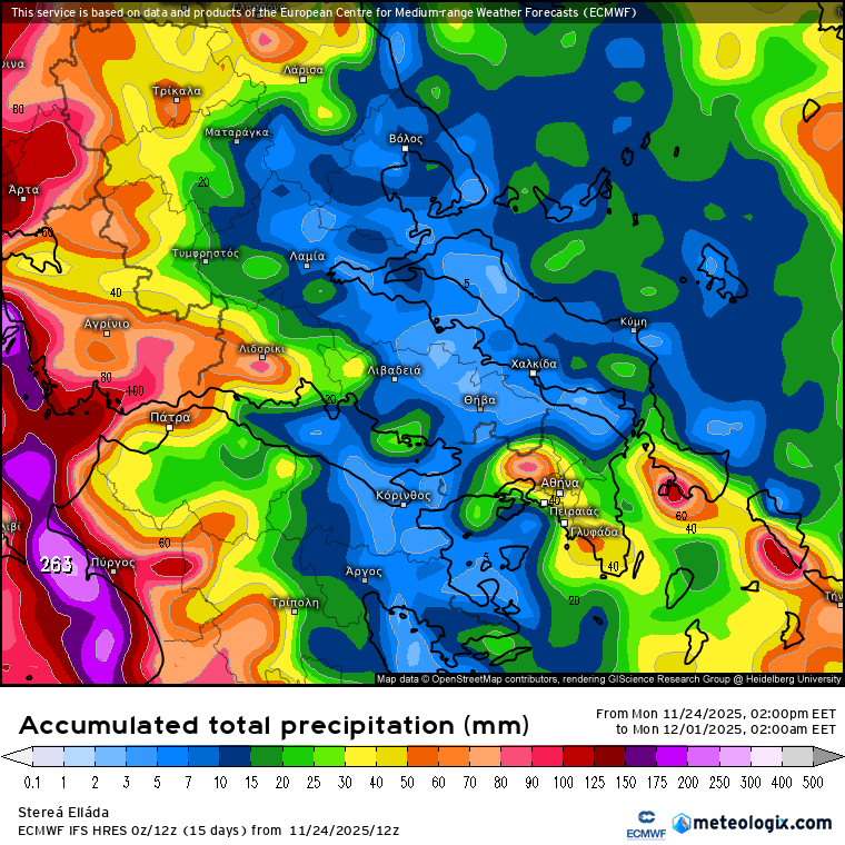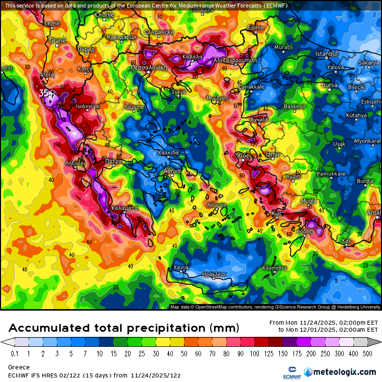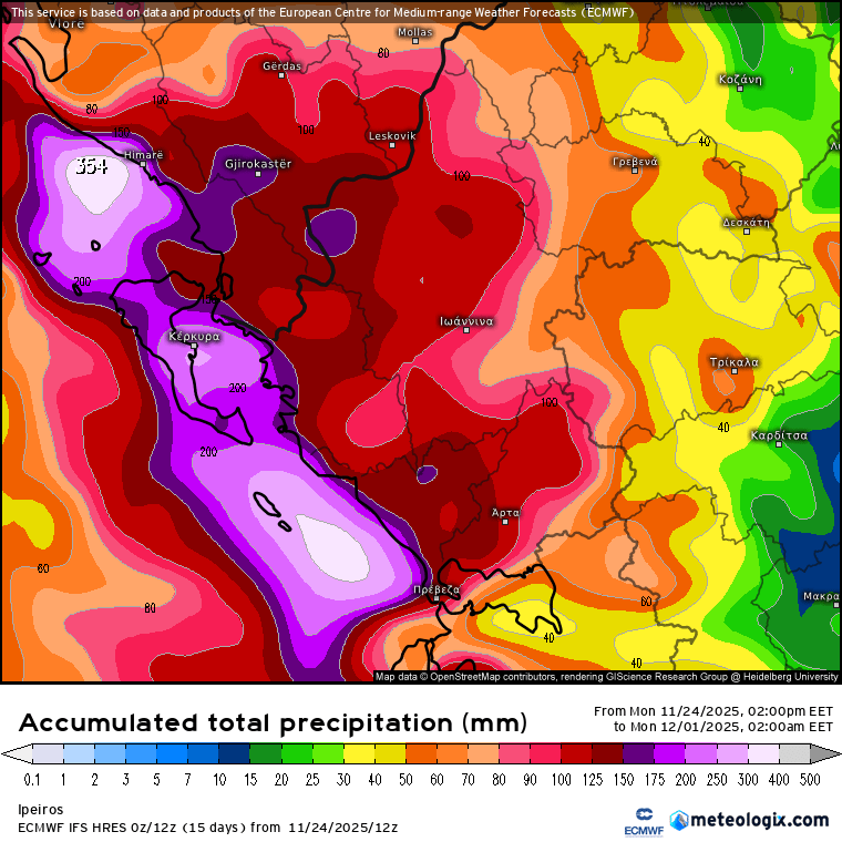 - Στο «στόχαστρο» σύμφωνα με όλα τα μοντέλα, είναι η ευρύτερη περιοχή του βορείου Ιονίου, όπου κατά τόπους (π.χ. Κέρκυρα), μέχρι το πέρας της κακοκαιρίας την Κυριακή, δίνουν έως και 200 τόνους νερό ανά στρέμμα συνολικά.